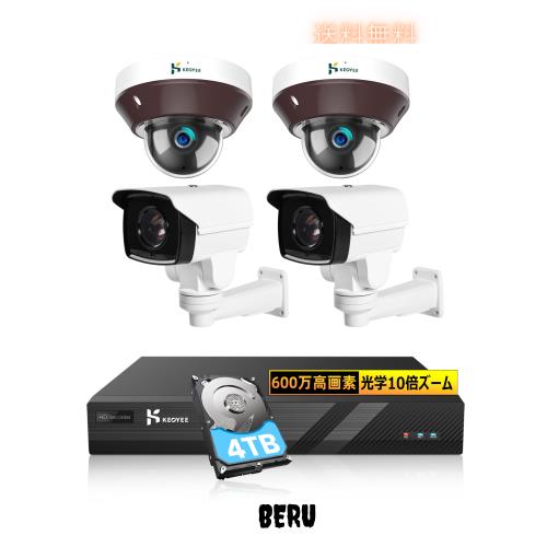 【光学10倍ズーム防犯カメラ】KEOYEE 600万画素 POE防犯カメラセット 360°全方位監視・4TB・PTZ首振り動体検知 監視カメラ 4台セット H.