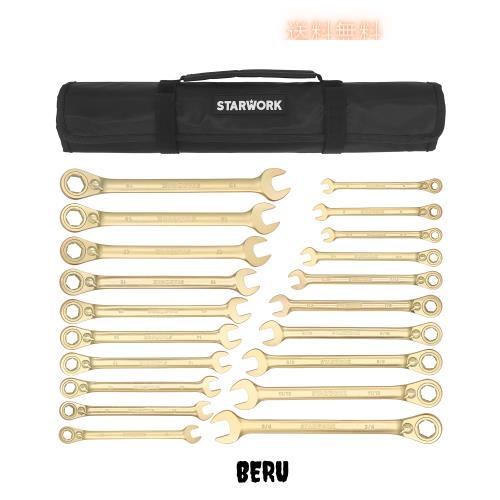 20本組 STARWORK 金色ラチェットレンチ 両用ヘッド ノンスリップギア XL ラチェットレンチセット (SAE/メトリック) 収納袋付