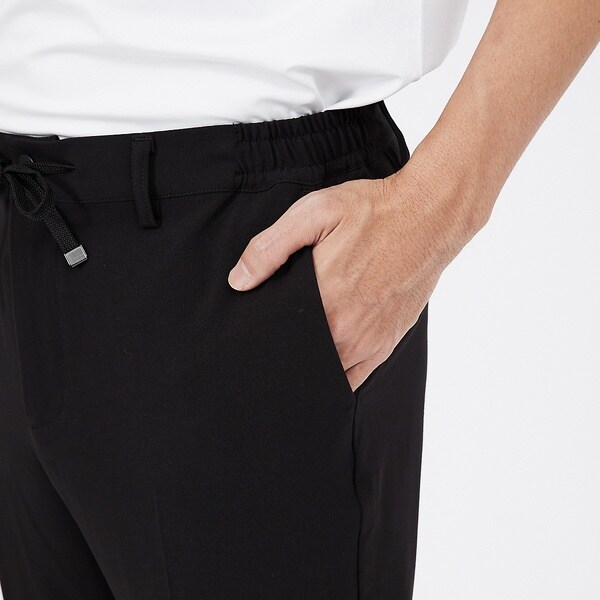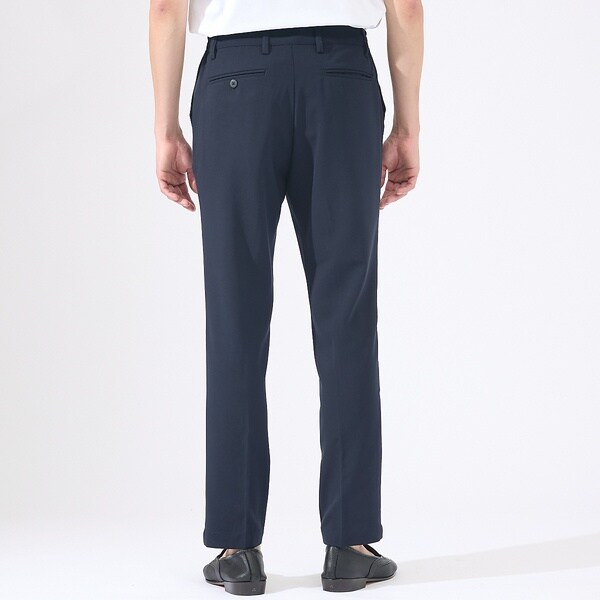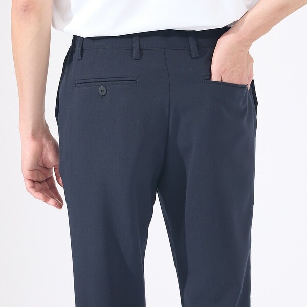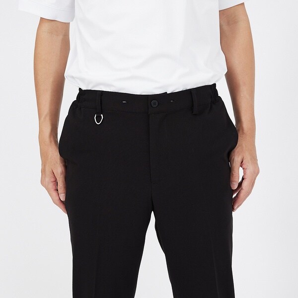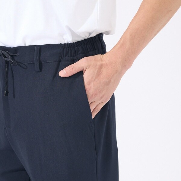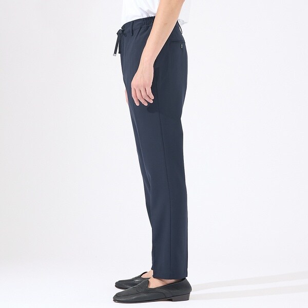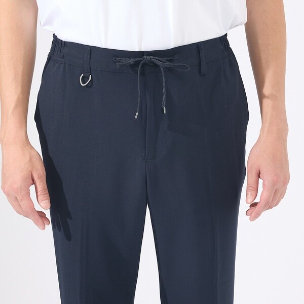 裾にかけてテーパードを効かせたすっきりとしたシルエット。ウエストはゴム+ドローコードのイージー仕様の為、単品スラックスとしても活躍します。