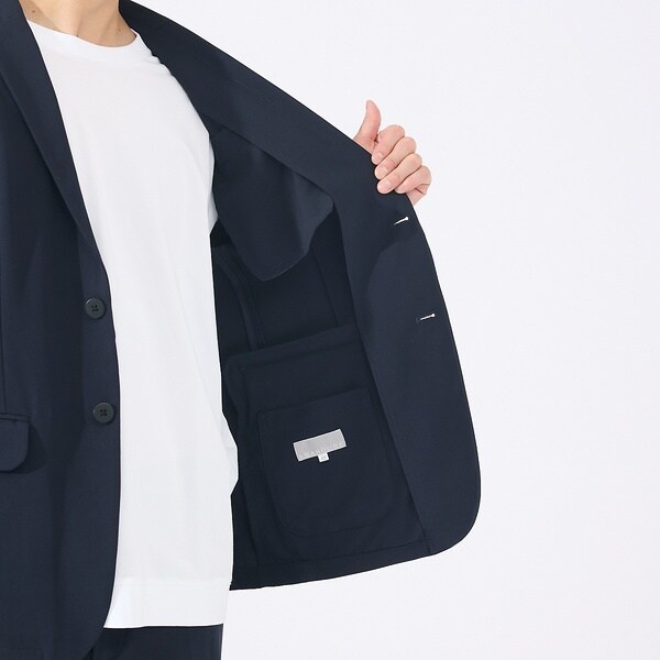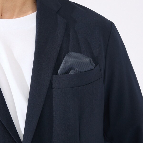 胸ポケットの裏地には、ポリエステル素材で同色系のシャドーストライプ柄の生地を使用しているのでポケットチーフ風な着用も可能。