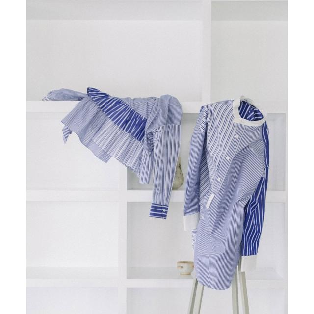 3種類の生地を組み合わせた、ランダムなフリルのショート丈シャツ。