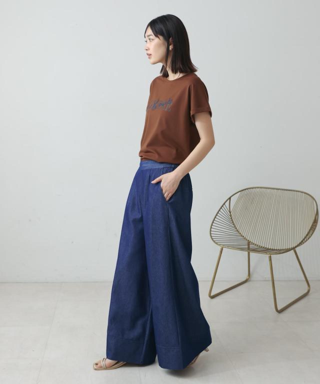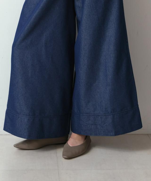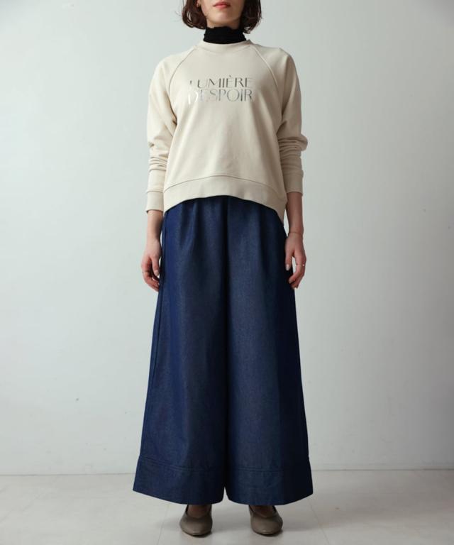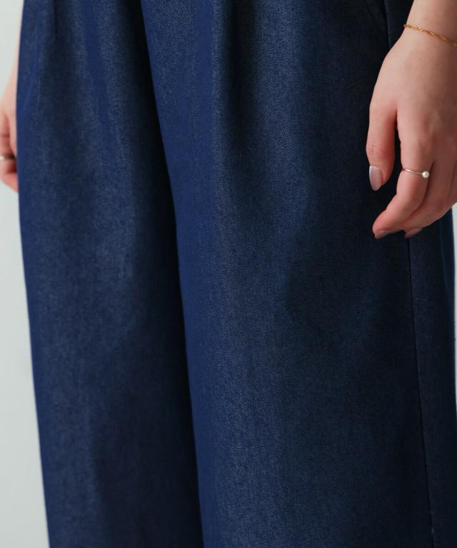 ベーシックなワイドパンツを肌触りの良いライトデニムで仕上げた一枚。ウエストもゴムで動きやすく、裏には紐ベルトが付いているので調整も可能です。