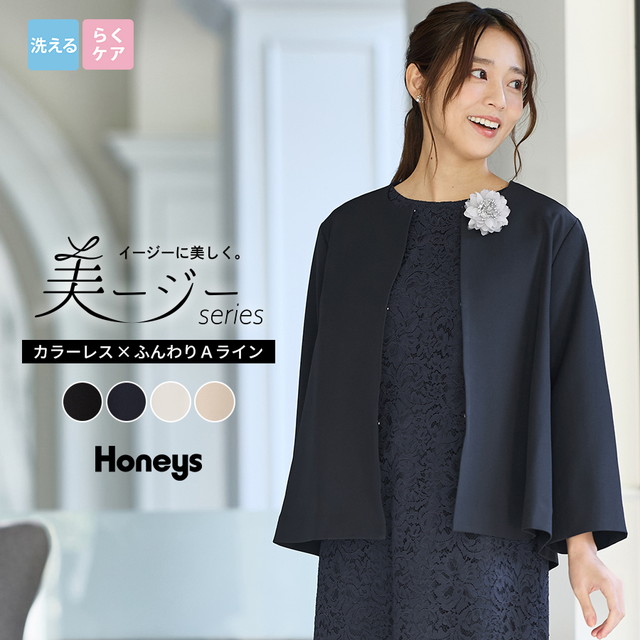 アウター ノーカラージャケット ジャケット セットアップ 大きいサイズ オフィス きれいめ レディース Honeys ハニーズ 9分袖Aラインノーカラージャケット