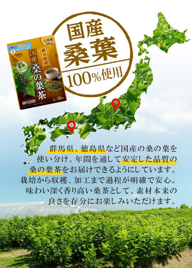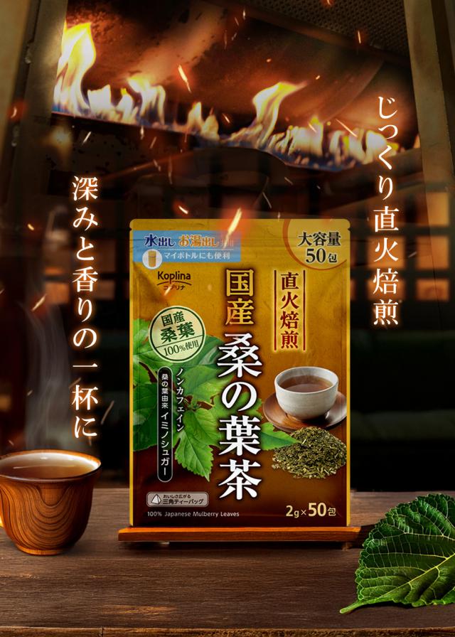 \新発売 クーポンご利用で5%OFF/国産桑の葉茶 2g x 50包【直火焙煎 イミノシュガー ノンカフェイン 三角ティーバッグ 大容量50包入り 国内製造 コプリナ】