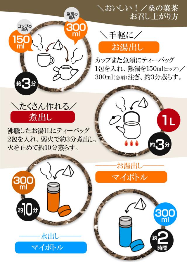 お召し上がり方 (急須の場合)急須にティーバッグ1包を入れ、300mlのお湯を注ぎ、約3分蒸らしてお召上がりください。