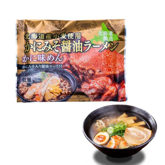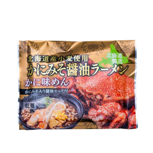 北海道産小麦を使用し、北海道で製造。かにパウダーを練りこんだ「かに味めん」と「かにみそ入り醤油スープ」で風味豊かな『かにみそ醤油ラーメン』に仕上げました。カニ好きの方におすすめです。 |