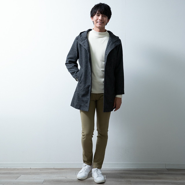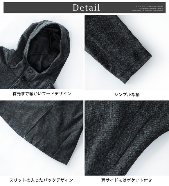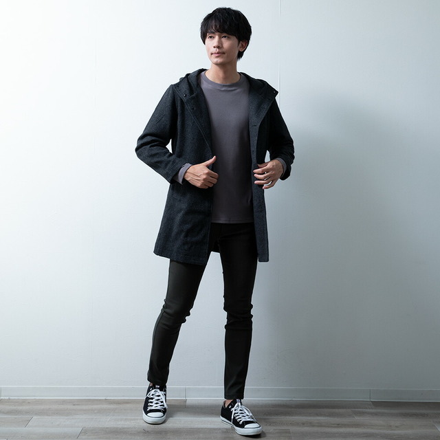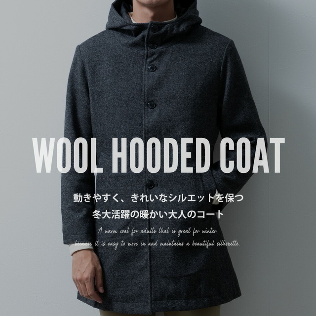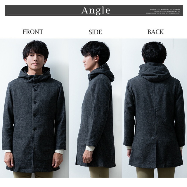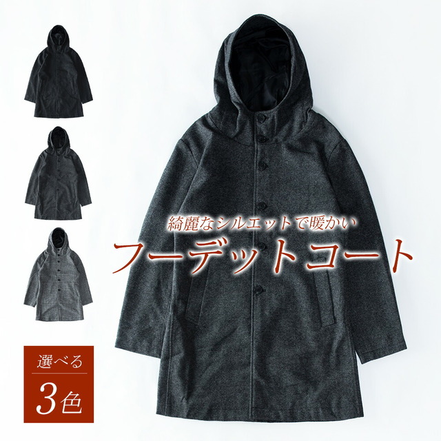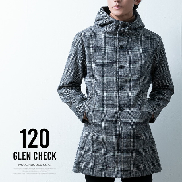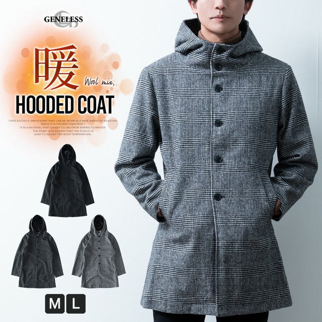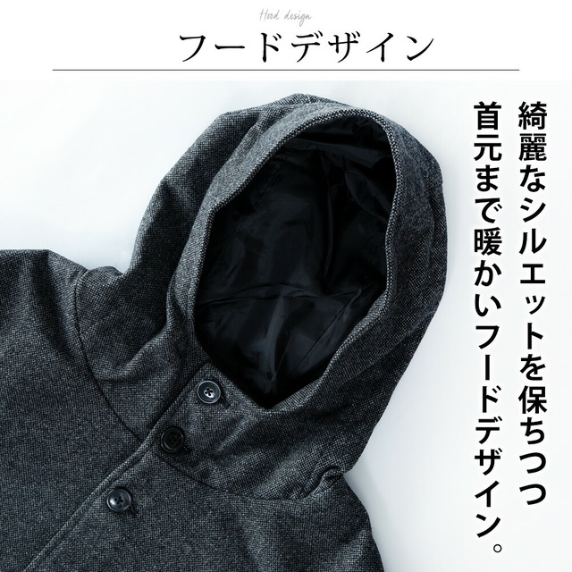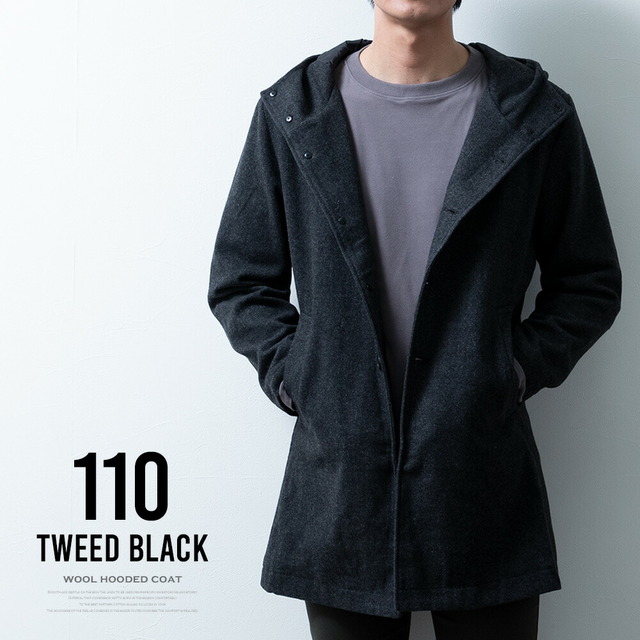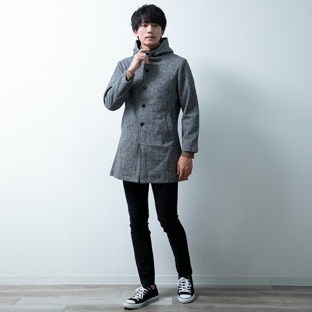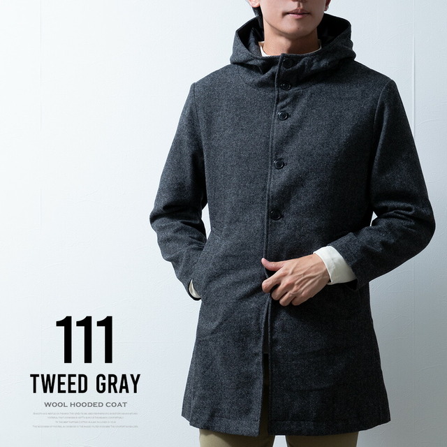 コート メンズ ウール フード フーテッドコート 秋冬 暖かい 細身 スリム ミドルコート おしゃれ グレンチェック ツイードグレー アウター 無地 ツイードブラック