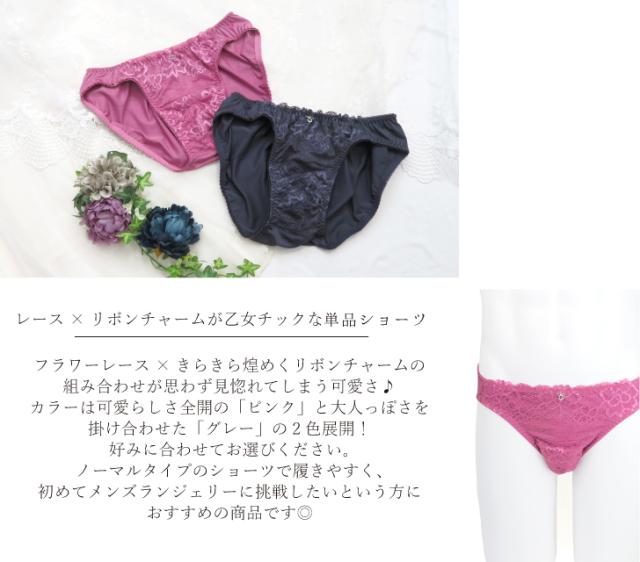 フラワーレース×きらきら煌めくリボンチャームの組み合わせが思わず見惚れてしまう可愛さ♪カラーは可愛らしさ全開の「ピンク」と大人っぽさを掛け合わせた「グレー」の2色展開!好みに合わせてお選びください。ノーマルタイプのショーツで履きやすく、初めてメンズランジェリーに挑戦したいという方におすすめの商品です◎