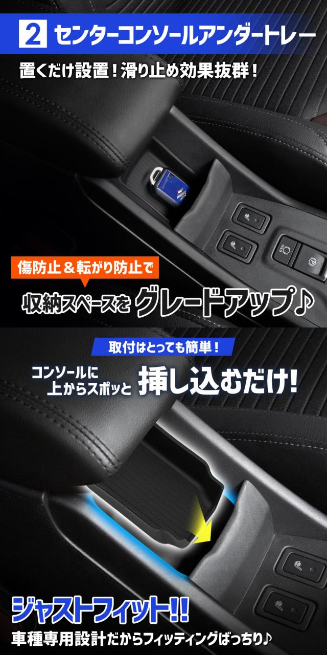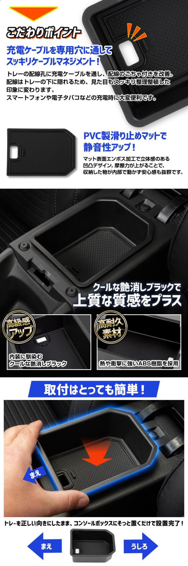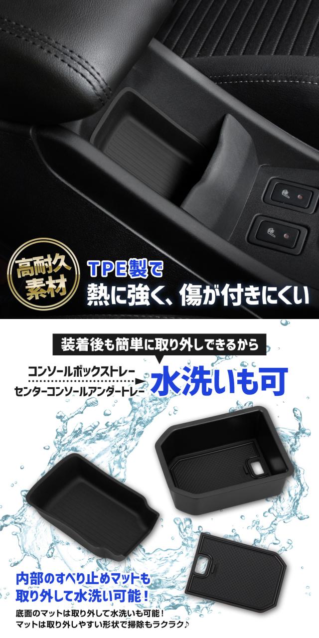コンソールボックストレー コンソールボックスにピッタリ収まる専用設計でフィット感は抜群! 走行中にカタカタと音がしないので、ストレスなくご使用いただけます。 トレーの深さは、収納しやすく中身を把握しやすい、使い勝手の良い5cmに設計。 純正コンソールボックスは深さが11cm以上あるので、上下に収納する事も可能に。 トレーを置いた後は、下段を目隠し収納として有効活用する事もできます。 また、トレーには充電ケーブルを通す専用穴を設けているので、配線のごちゃつきもスッキリ解決! 配線はトレーの下に隠れるため、見た目もスッキリ整理整頓された印象に。 スマホやタバコ、鍵などよく使う物を置くスペース、として"いつもの定位置"が出来上がります。 コンソールボックストレー本体はABS樹脂製のクールな艶消しブラックで車内にさりげない高級感をプラス。 トレー内部の滑り止めマット(PVC製)は取り外して水洗いが可能なので、いつでも清潔にしておくことができます。 センターコンソールアンダートレー コンソルの収納スペースをグレードアップできる車種専用設計のセンターコンソールアンダートレー! ピッタリ収まる専用設計でフィット感は抜群! 熱に強く、傷が付きにくいTPE製(熱可塑性エラストマー)の素材です。 走行中にカタカタと音がしないので、ストレスなくご使用いただけます。 |