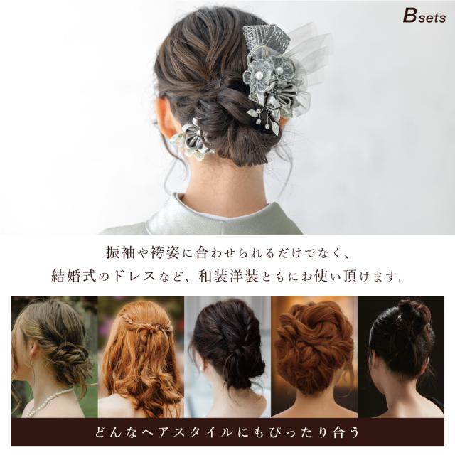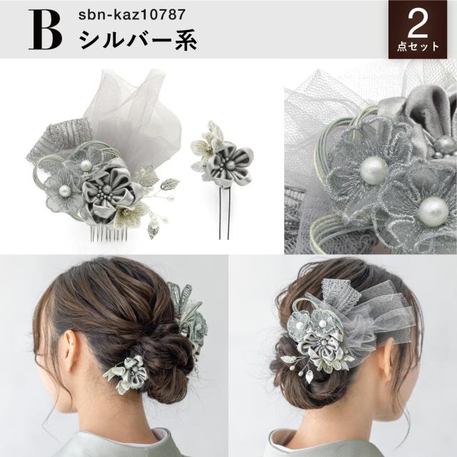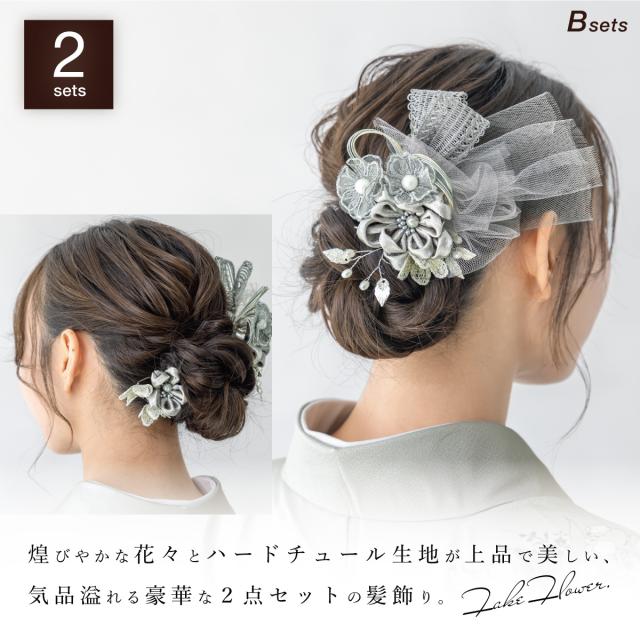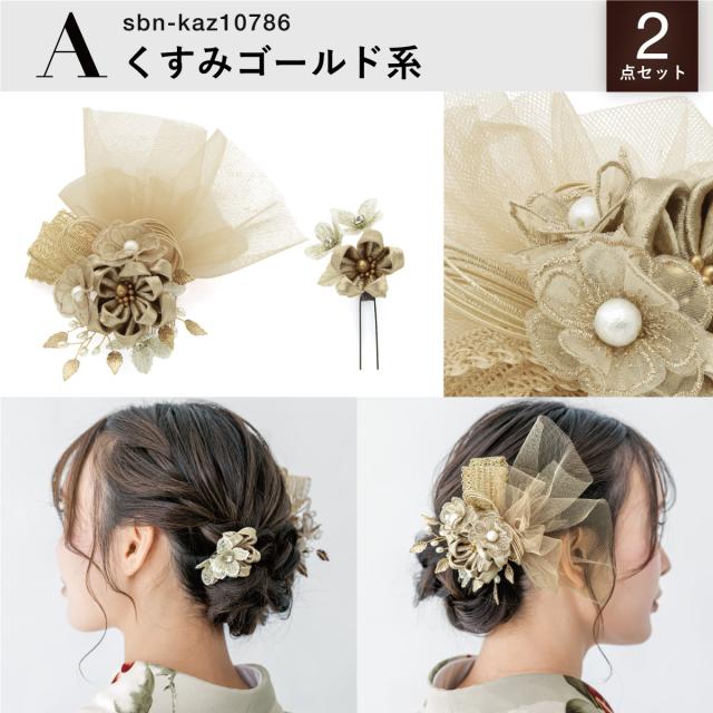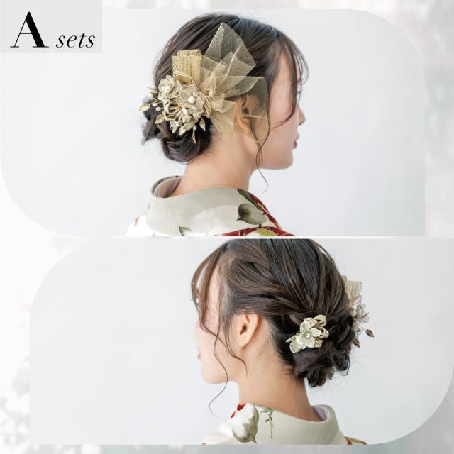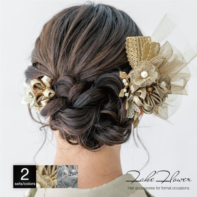 髪飾り 2点セット 成人式 卒業式 ゴールド ブラウン グレー シルバー チュール 花 リボン コサージュ ヘアアクセサリー 振袖用 袴用 送料無料
