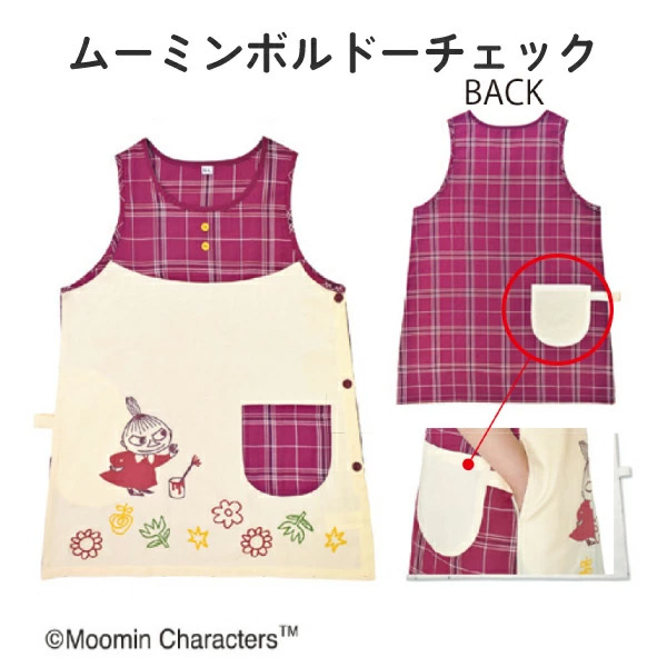 キャラクターエプロン ムーミン チェックボルドー サイドボタン 着脱しやすい タオルホルダー付 保育士 保育園 幼稚園