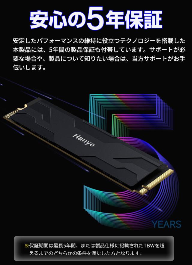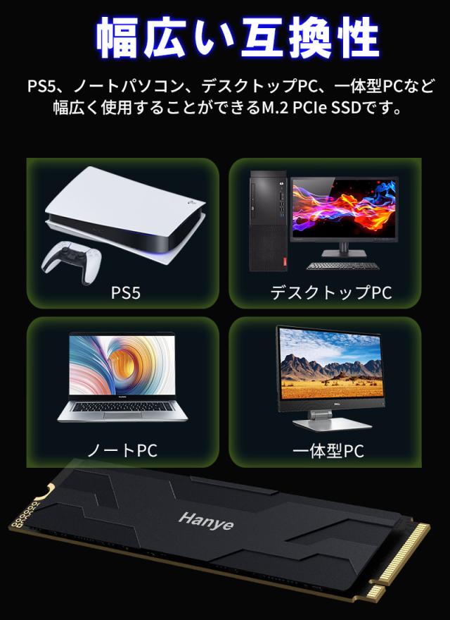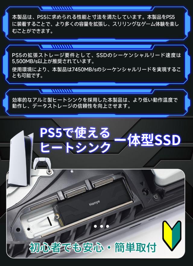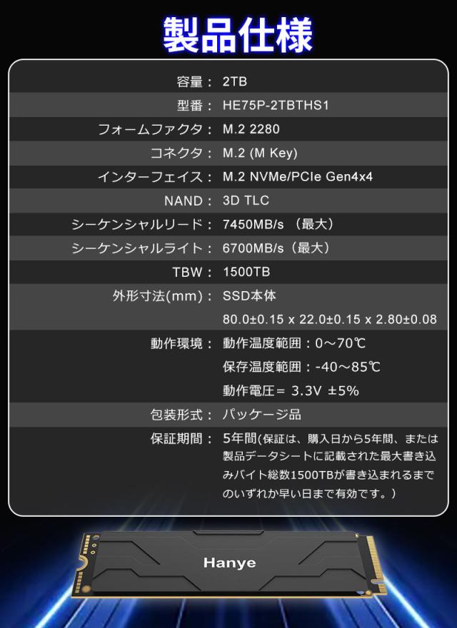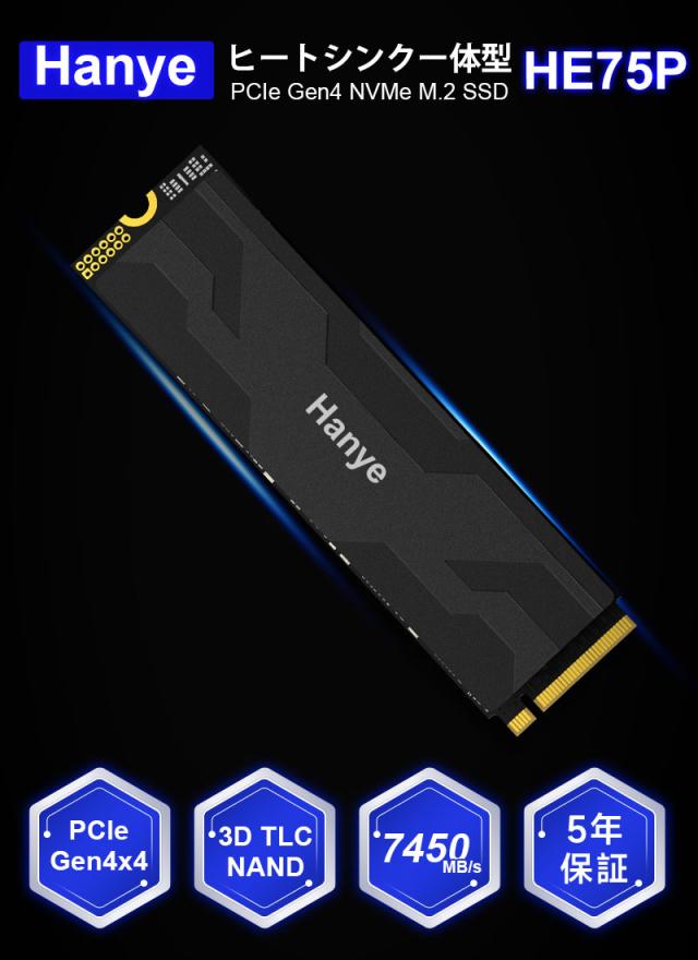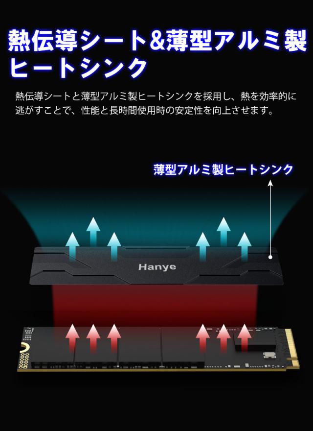 Hanye NVMe SSD 2TB 3D NAND TLC 薄型アルミ製ヒートシンク搭載 PCIe Gen 4x4 PS5 Pro/PS5 Slim/PS5動作確認済み R:7450MB/s W:6700MB/s M.2 2280 SSD国内5年保証 ネコポス送料無料 ポイント消化