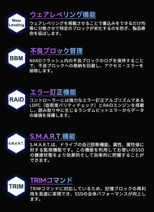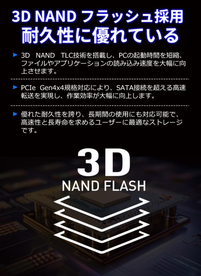 3D TLC NANDフラッシュを採用することで、高い信頼性と優れた耐久性を実現します。これにより、PCの起動時間が短縮され、ファイルやアプリケーションの読み込み速度が大幅に向上します。さらに、高いTBWを提供し、長期間にわたる使用にも耐えるため、高速性と長寿命を求めるユーザーに最適な選択です。