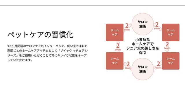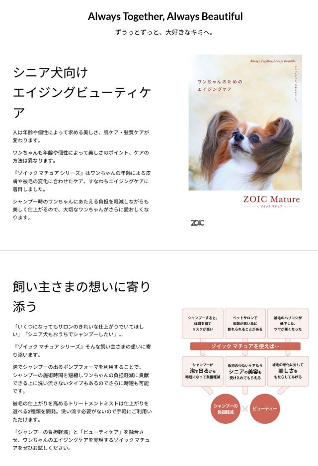 『ゾイック マチュア シリーズ』はワンちゃんの年齢による皮膚や被毛の変化に合わせたケア、すなわちエイジングケアに着目しました。