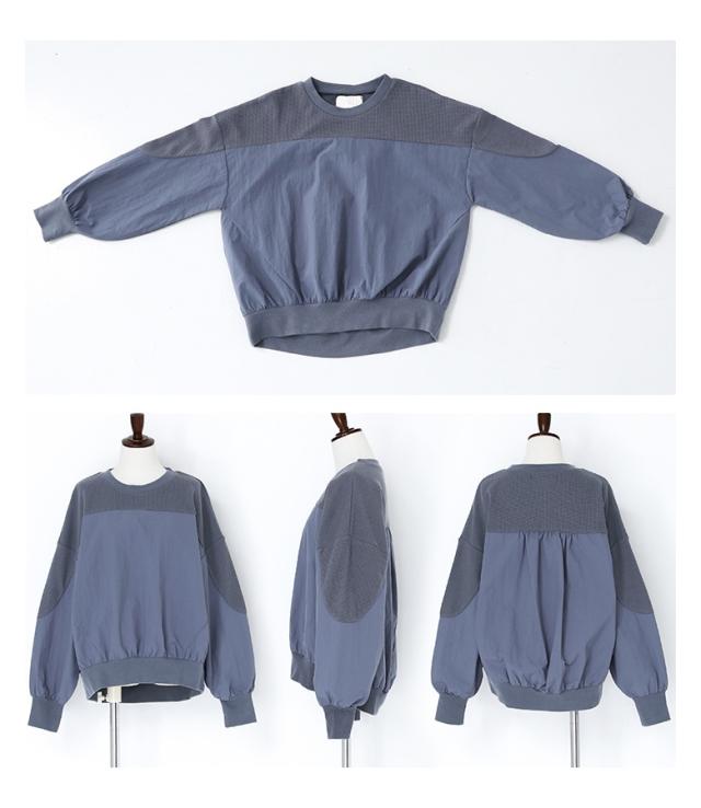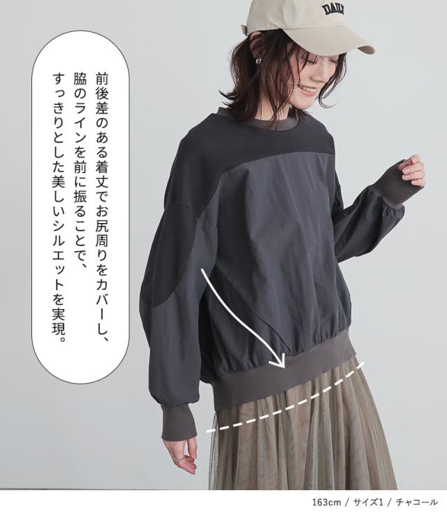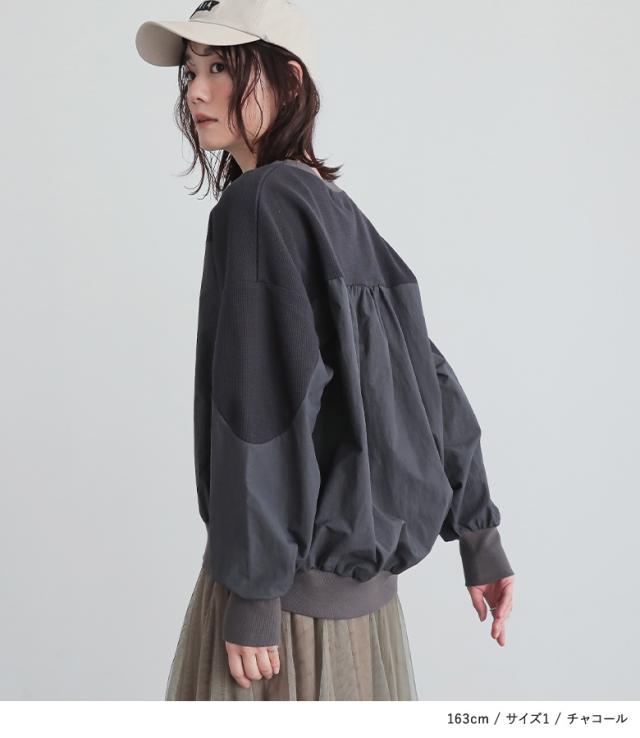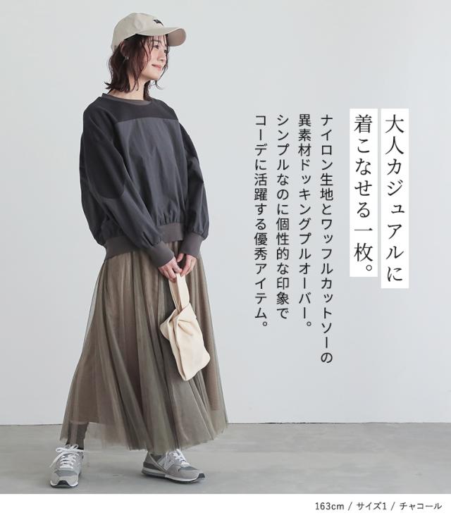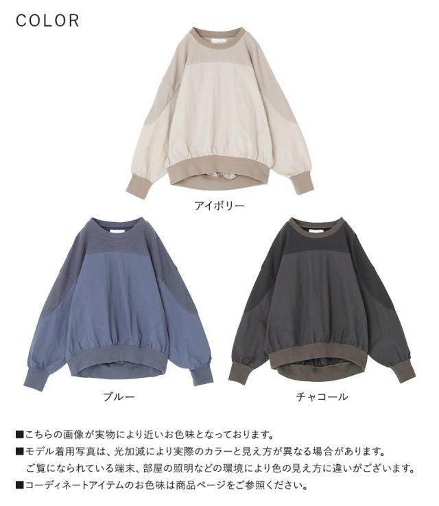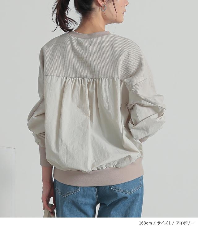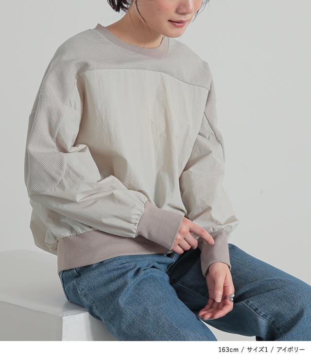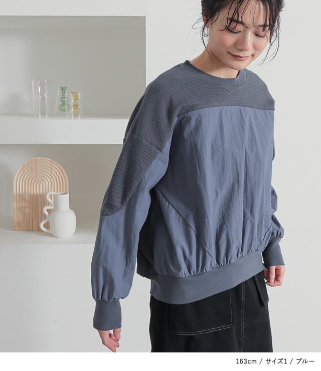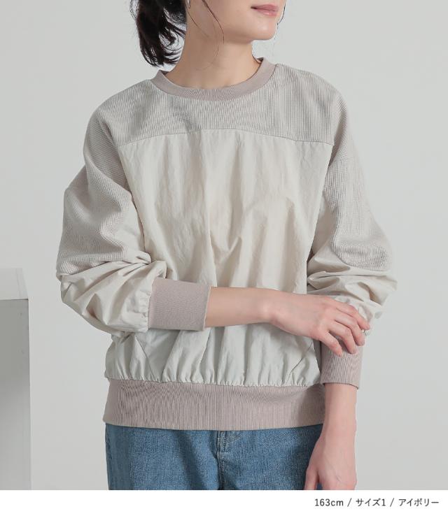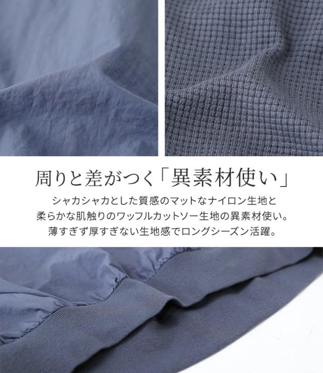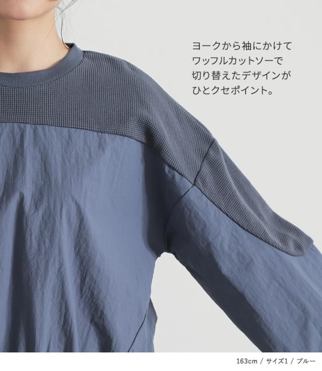 『異素材切り替えプルオーバー』※メール便可※【10】[カットソー レディース トップス 長袖 異素材 ナイロン 綿混 ワッフル生地 プルオーバー 配色 無地 ドッキング 春]