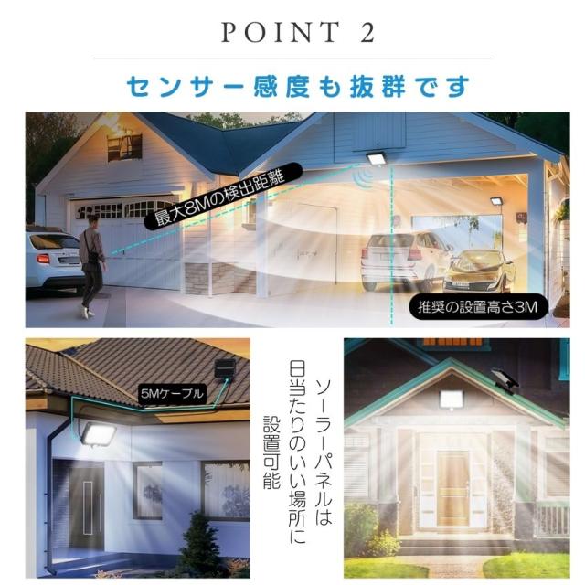 明るさ・防犯・省エネのすべてを叶える、最新のソーラーセンサーライトが登場しました!195個のCOB LEDによる爆光と、ライトとパネルの分離設計で、