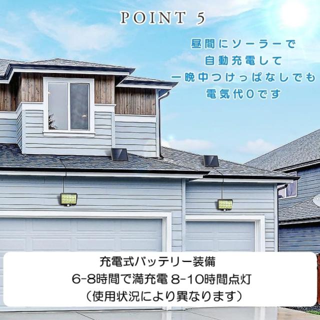 あらゆるシーンに対応可能。さらに延長コード5m付きで、設置場所の自由度も抜群です。昼間にソーラーで自動充電し、夜間は電気代ゼロで一晩中使用可能。