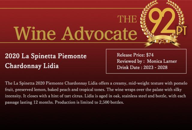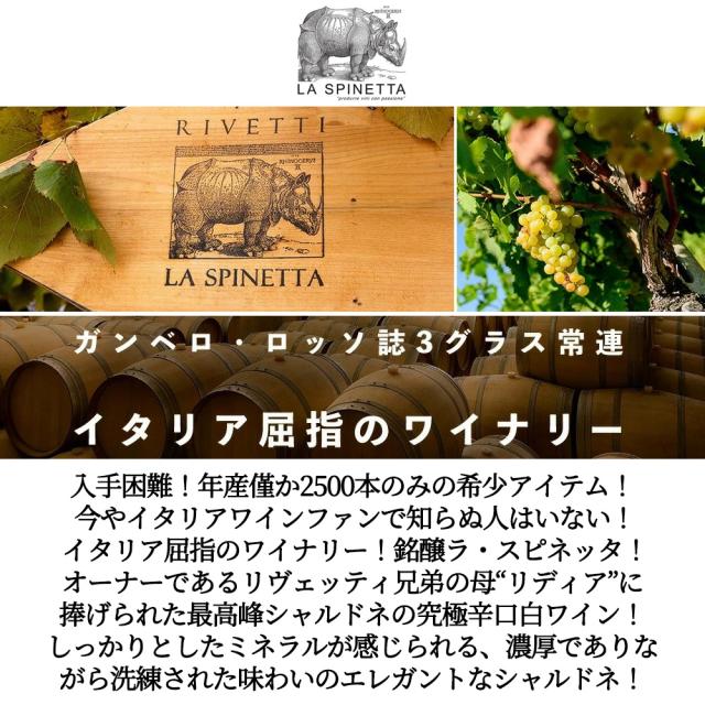 入手困難!年産僅か2500本のみの希少アイテム! 今やイタリアワインファンで知らぬ人はいない! イタリア屈指のワイナリー!銘醸ラ・スピネッタ!オーナーであるリヴェッティ兄弟の母“リディア”に捧げられた最高峰シャルドネの究極辛口白ワイン!しっかりとしたミネラルが感じられる、濃厚でありながら洗練された味わいのエレガントなシャルドネ!