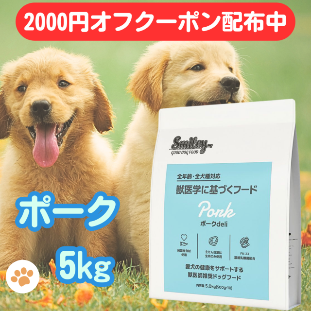 2000円オフクーポンあり スマイリー 国産 ポークデリ 賞味期限2026年11月 ポーク 5kg ドッグフード 純国産 無添加 犬 デリ 日本製 ペットフード Smiley わんちゃん こだわり 一般食 アミノ酸 健康 皮膚 フリーズドライ 人気 安心 業務用 お得 人気 安い