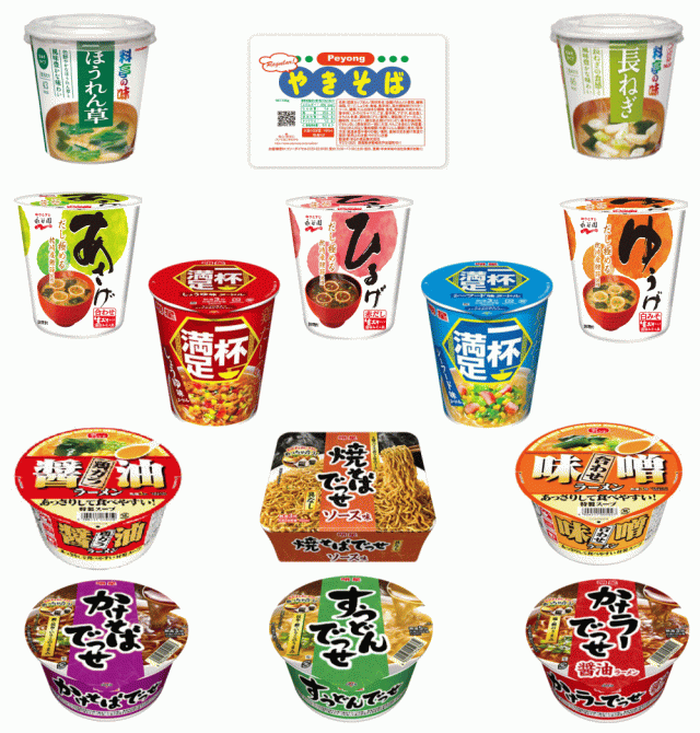 明星食品から、焼きそば、かけラーメン、かけそば、素うどんなどのでっせシリーズ。持ちやすい縦型の一杯の満足。大黒食品では、あっさりラーメン味噌・醤油。マルカ食品では、ペヨングソース焼きそば。健康管理にお勧め!!みそ汁もセットしています。マルコメ味噌汁。永谷園 あさげ ひるげ ゆうげ 等。お食事シーンに合わせたオールインワンセットです。