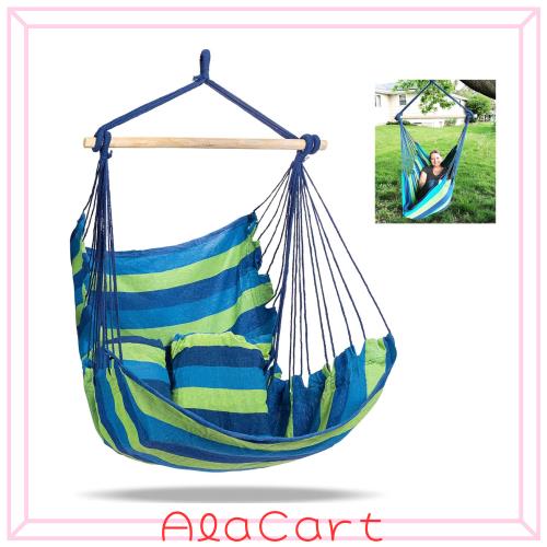 厳選された高品質のポリエステル綿で作られ、快適で抜群な通気性があります、夏の使用に最適で、通気性があり涼しいです。パッケージ内容:ハンモックチェア*1、木の棒*1、クッション*2、結ばれたロープ*2。