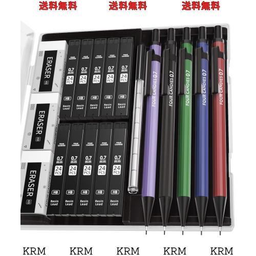 Four Candies 0.7mmシャープペンシルセット(ケース付) - 5本入りメタルシャープペンシル、10本入りHB #2芯替芯、3本入り4B消しゴム、9