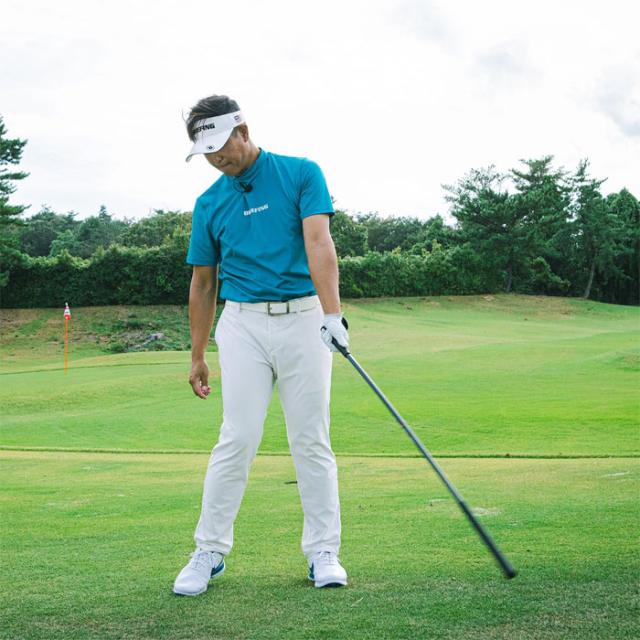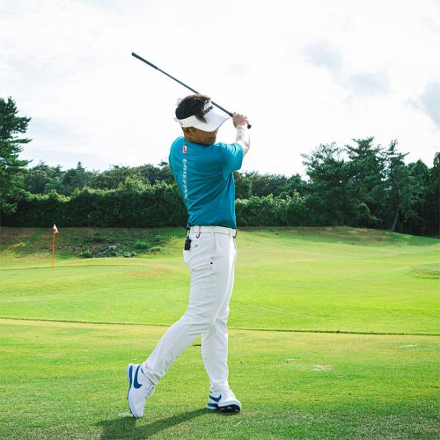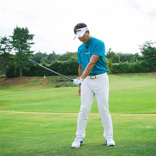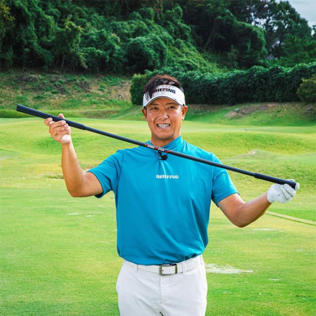 短い方のグリップを右手で握り、タメを感じながら振ることで、長いインパクトゾーンが作れます。