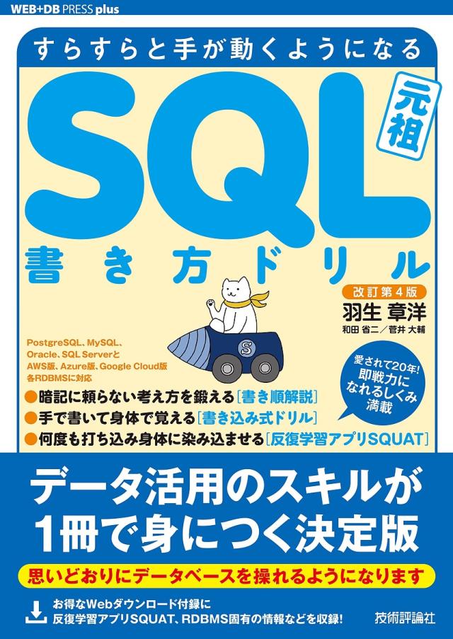 SQLがドリル形式で自然に習得できる「SQL書き方ドリル」の改訂第4版です。第3版までCD−ROM提供していた学習ソフトSQUATなどの付録コンテンツはWebダウンロード形式になります。SQLはPostgreSQL、MySQL、Oracle、SQL Serverと、AWS、Azure、Google Cloud版の各RDBMSに対応します。