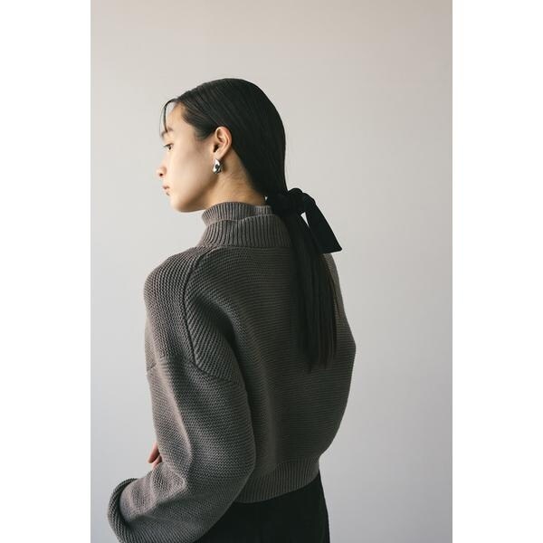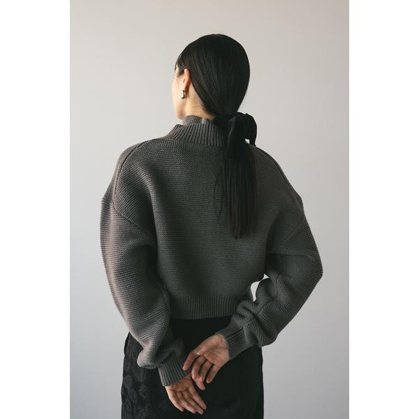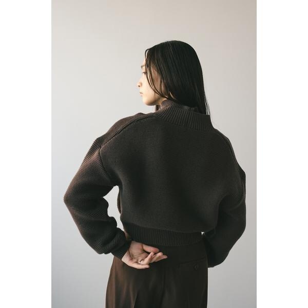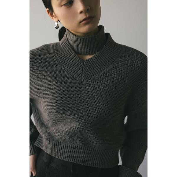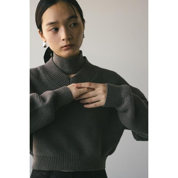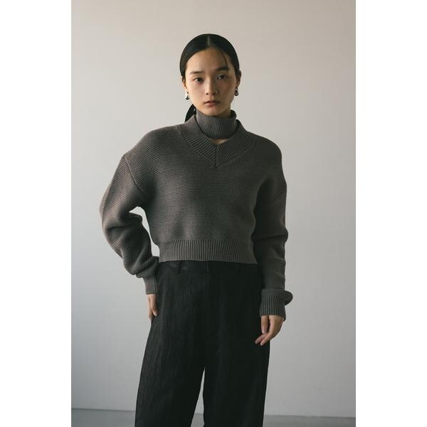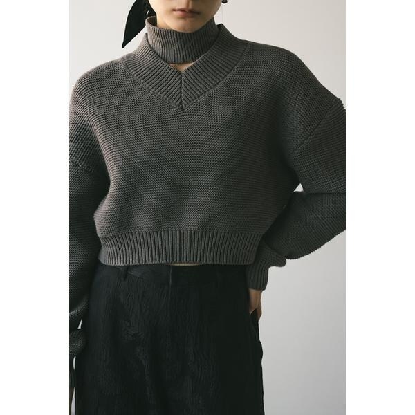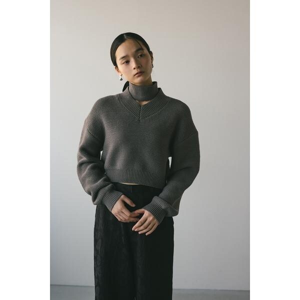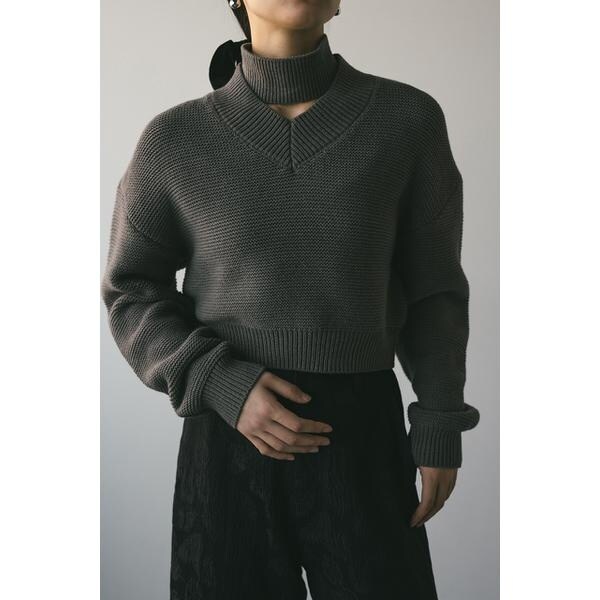 モデル身長163cm(FREEサイズ着用)ハイネックチョーカーとVネックからのぞく肌見せがポイントのショートニット。スタイリングの主役になる一枚です。透け感なし、ストレッチあり。【お手入れ方法】手洗い可