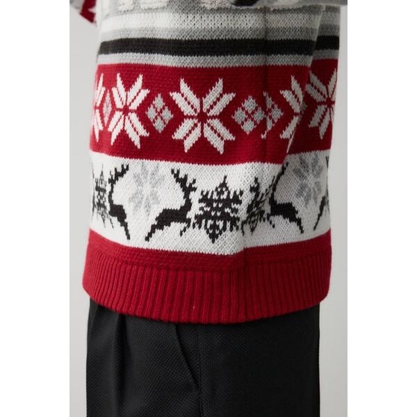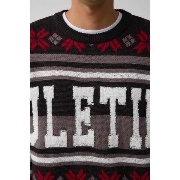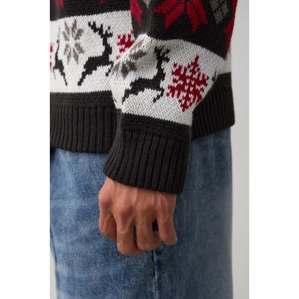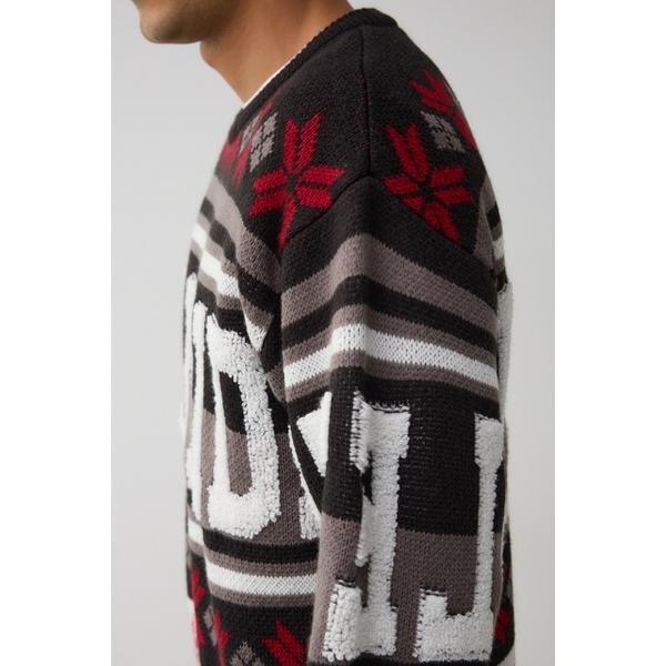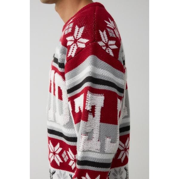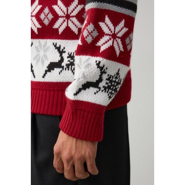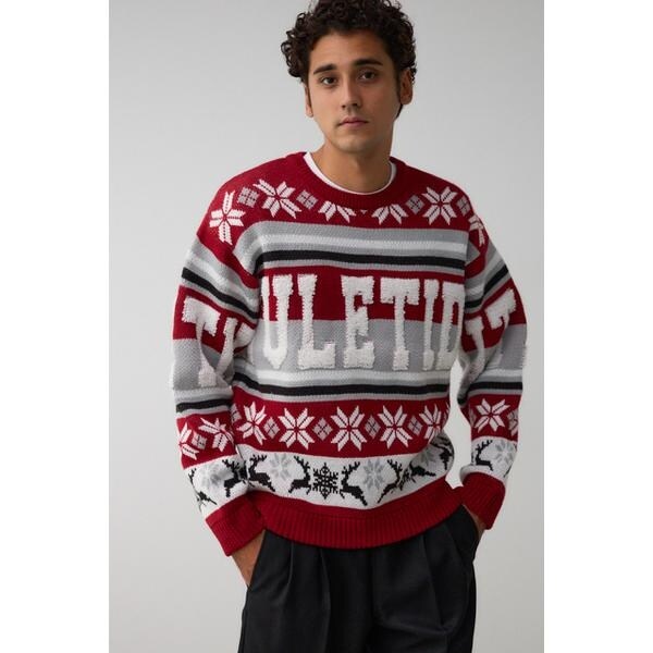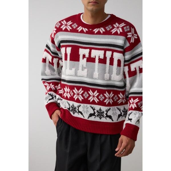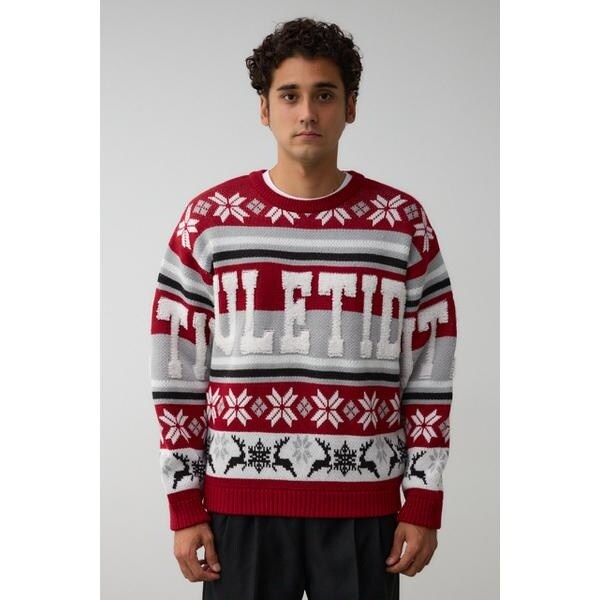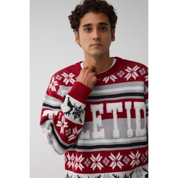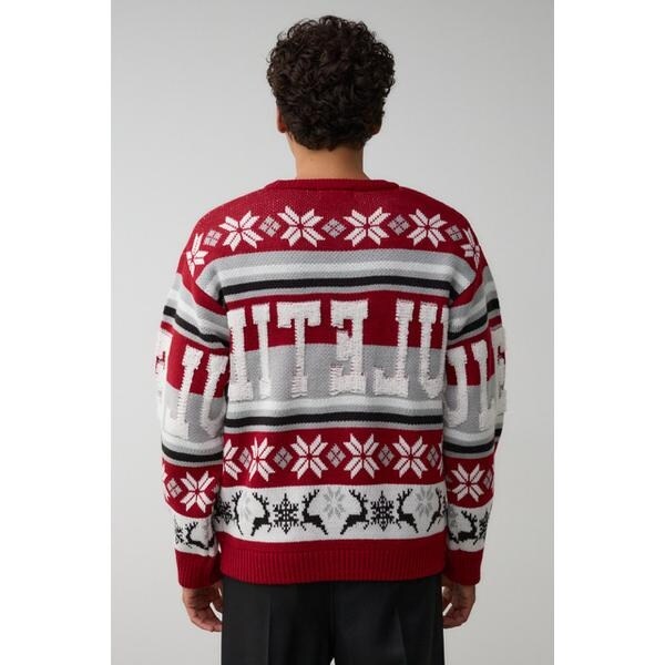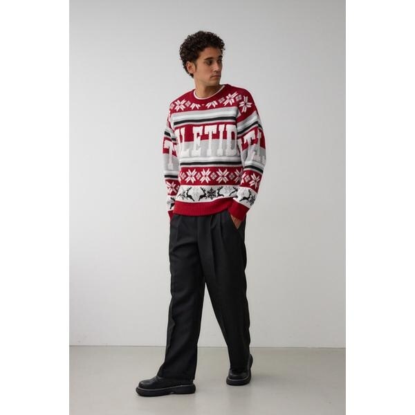 ■ノルディックアグリーニット■ポイント凹凸感のあるジャガード織りが特徴的なニットです。■ディティール1サイズでややゆったりシルエットです。アメリカのアグリークリスマスをデザインに落とし込んだポップなデザインニットになります。1枚でも存在感があり、表面感のあるジャガードが高見えさせてくれます。■スタイリングデニム合わせでカジュアルなスタイルにお勧めです。■生地ループ編み仕様の組み合わせのジャガード編みのため、編地と素材の特性上、編地表面にネップや糸の浮きは多少生じてしまいます。また、ループ部分の引っ掛けには十分、ご注意ください。慎重にお取り扱いください。ロゴ部分はシングルジャガード編みで、ループロゴ部分に小さな穴のような編地また地の配色が入りますが、ニットの編み生産工程上避けられません。B品ではありませんのでご了承ください。透け感:なし裏 地:なし伸縮性:なし光沢感:なし