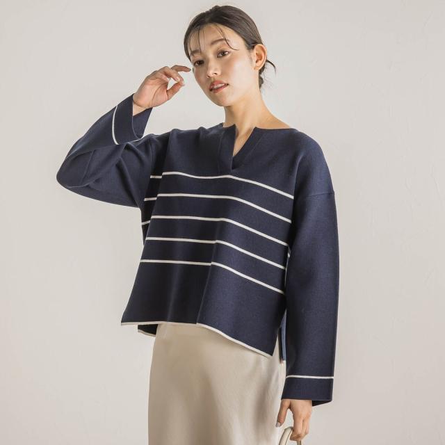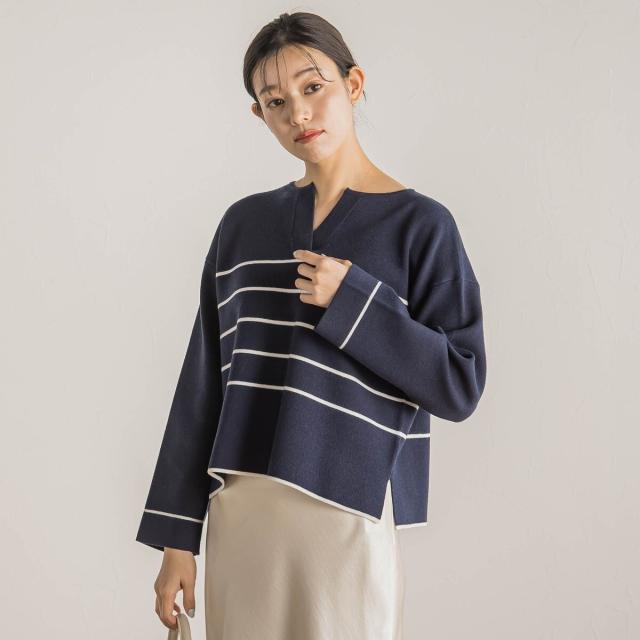 スリットネックのデザインが女性らしいニットプルオーバー。