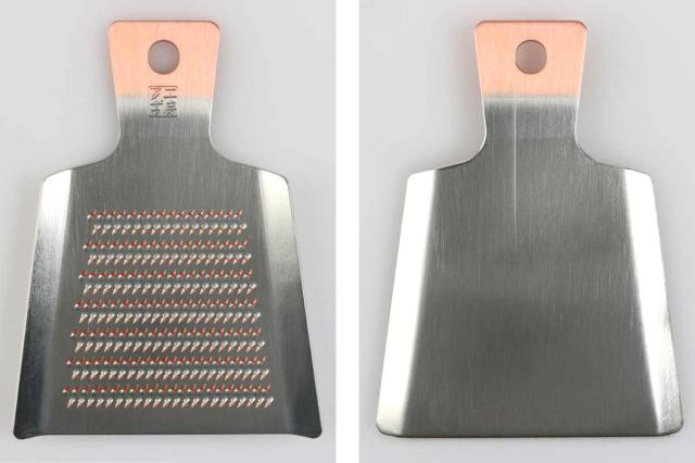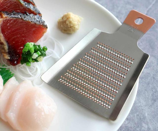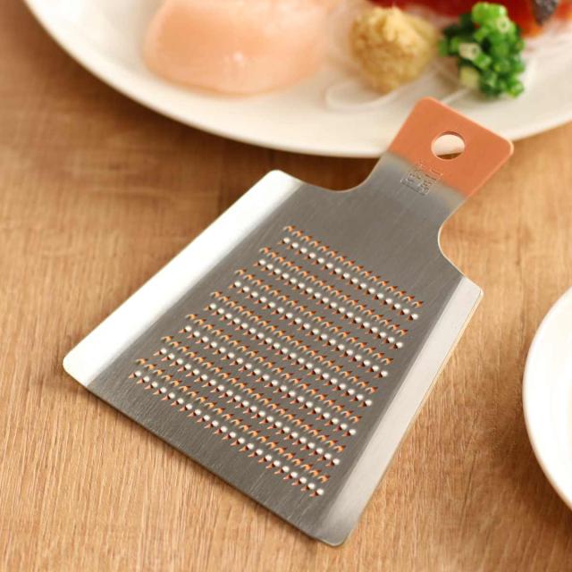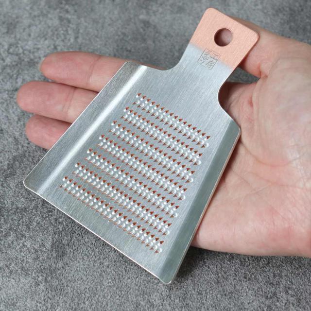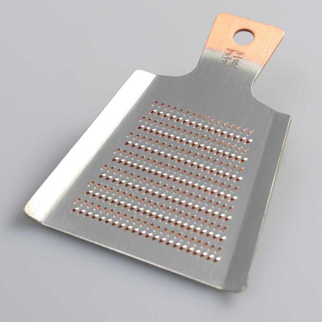 純銅製に錫めっきが施された耐久性と切れ味に優れた手のひらサイズのおろし金。長く愛用できる丈夫なおろし金は使う度に風合いが増し、自分仕様に変化していくことで愛着が湧き欠かせない道具になります。