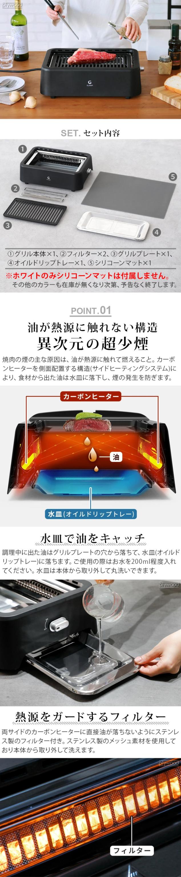 | グリル本体×1、フィルター×2、グリルプレート×1、オイルドリップトレー×1、シリコーンマット×1 ※シリコーンマットはパッケージに同梱されています。ホワイトのみシリコーンマットは付属しません。その他のカラーも在庫が無くなり次第、予告なく終了します。 |