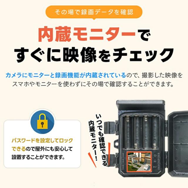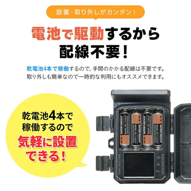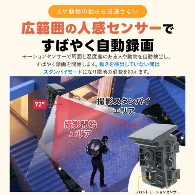 また、赤外線センサーが人や動物を感知した場合のみ撮影・記録をするので、不要なバッテリーの消耗も削減します。