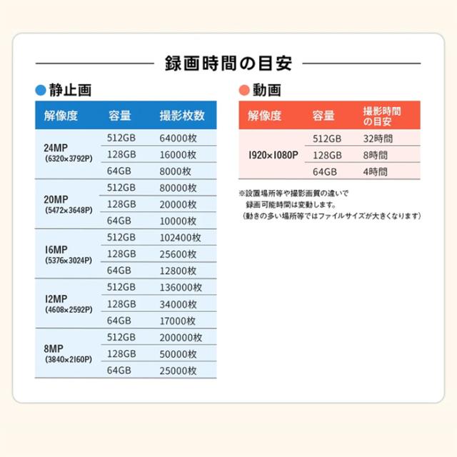 記録媒体にはmicroSDカード(別売)を採用しており、最大512GBまで対応します。
