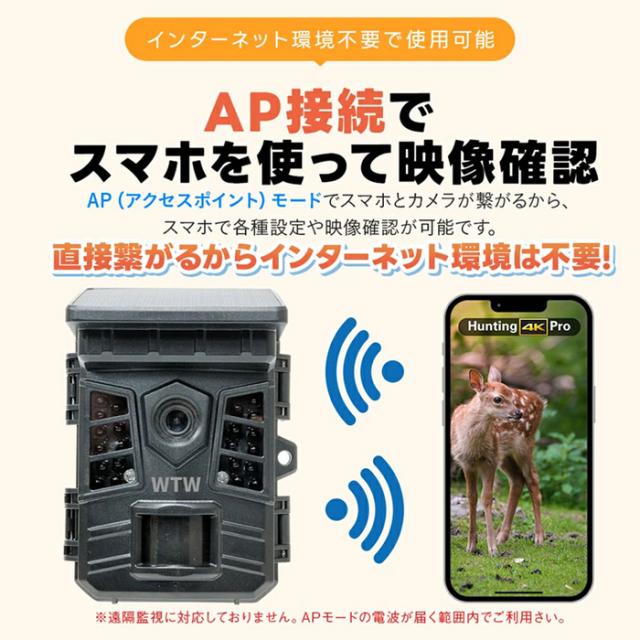 WTW-TCS36APは、スマートフォンと直接接続できるAP機能を搭載した、ソーラーパネル一体型屋外設置対応200万画素トレイルカメラです。
