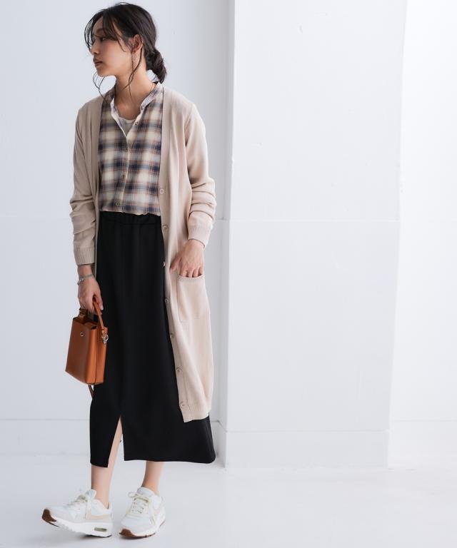 気軽に羽織れて着回しが効く、シンプルロング丈カーデはどんなスタイリングにも1枚羽織るだけでこなれ感のあるスタイリングが完成します。