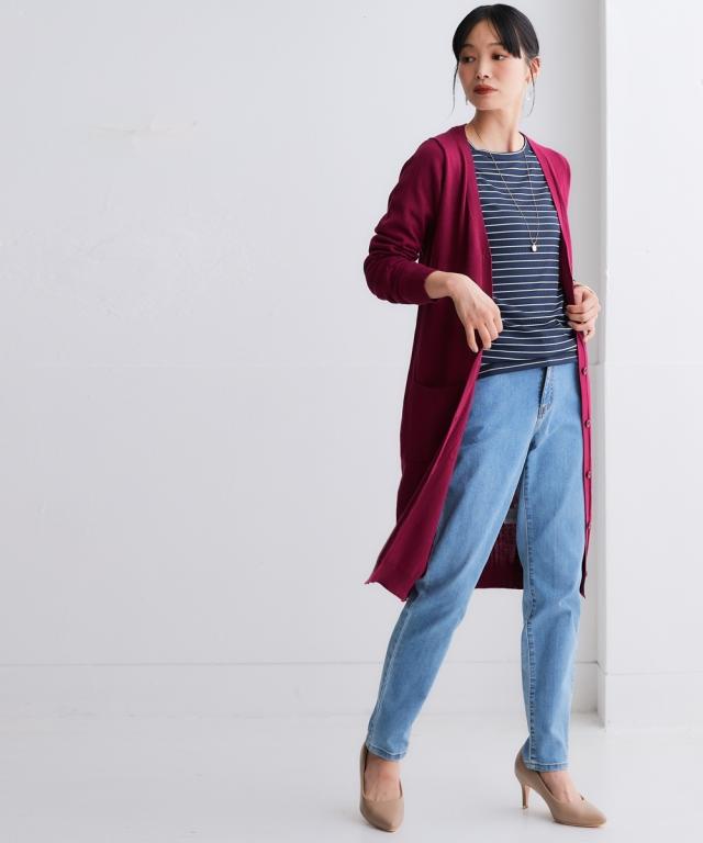 気軽に羽織れて着回しが効く、シンプルロング丈カーデはどんなスタイリングにも1枚羽織るだけでこなれ感のあるスタイリングが完成します。