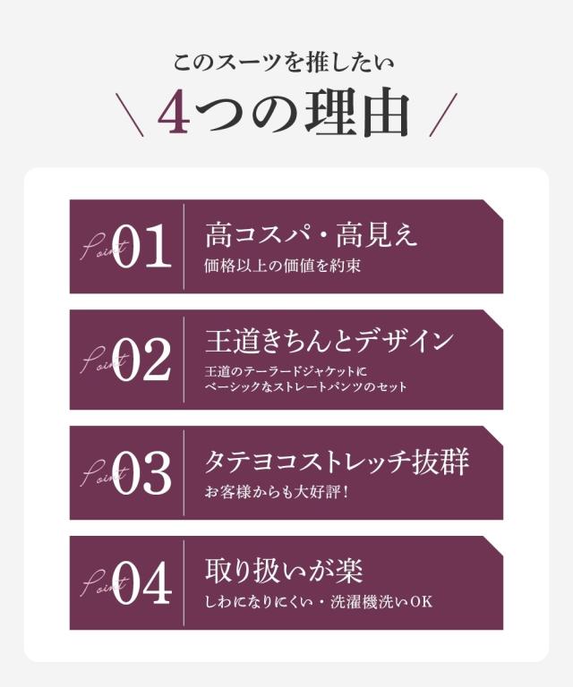 品質=[表地]ポリエステル65%・レーヨン30%・ポリウレタン5%(平織) [裏地]有(ジャケット:背抜き パンツ無) ジャケット:肩パッド有(取外し不可) 前ボタン開 ポケット前2・左胸・左内 袖口スリット 後ベンツ パンツ:前ファスナー内ボタン付ホック開 ウエスト後ゴム入 ポケット両脇・後飾り ※この商品は2点同サイズのみで販売します。※LLサイズから五面体仕様です。 原産国:中国製 洗濯表示:洗濯機OK ネット使用
