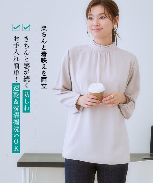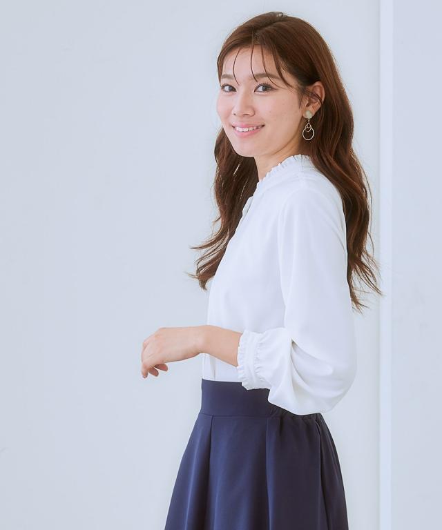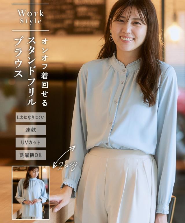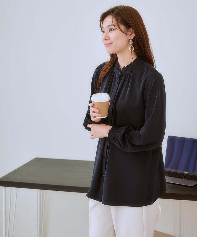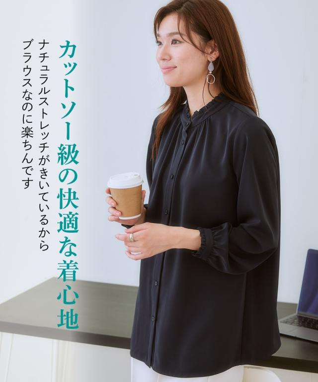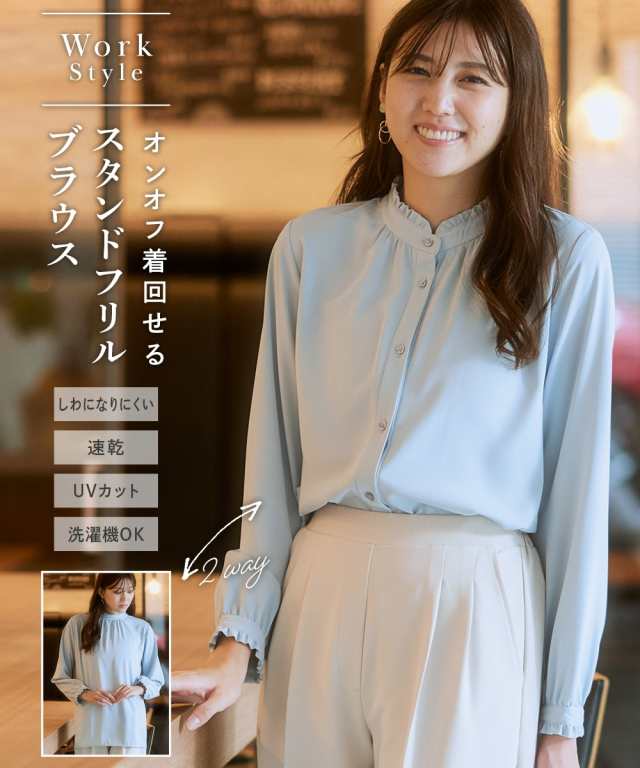 【大人の甘映えフリルブラウス】ほどよいかわいさの控えめなバンドカラーフリル。コーデ力がアップする前後2WAY仕様。■ポイント ・滑らかでとろみのあるトレッチパウダーサテンシリーズ。 ・オンオフたっぷり着まわせる前後2WAYデザイン。■デザイン ・ボタン側を前にしたバンドカラーブラウスとボタン側を後ろにしたプルオーバー風ブラウスが楽しめる前後2WAY。 ・オンオフ着まわせるスタンドフリルブラウス。 ・襟下と袖口にあしらったシャーリングデザインが繊細な雰囲気を演出。 ・タックアウトのパンツ合わせも決まるほどよい丈感。■素材 ・働く女性の毎日をサポートする「しわになりにくい、速乾、洗濯機OK、UVカット」の優秀機能素材。 ・光沢感とストレッチ感のあるパウダーサテン生地。 ・UVカット機能付き。■おすすめのスタイリング ・ギャザー側を前にしたジャケットインスタイルがおすすめ。 ・ボタン側を前にしてパンツと合わせ、タックアウトしたスタイルも素敵。〜7days Life Styling〜 仕事の日、休日、イベントの日まで、 働く女性の毎日を商品やコンテンツを通して、 自分らしく快適でいられる“働く服改革”をサポートします。