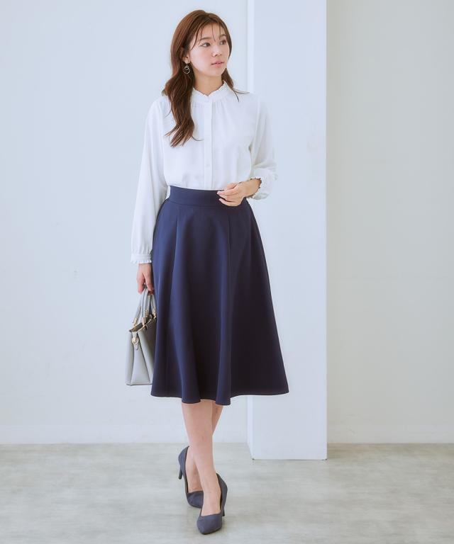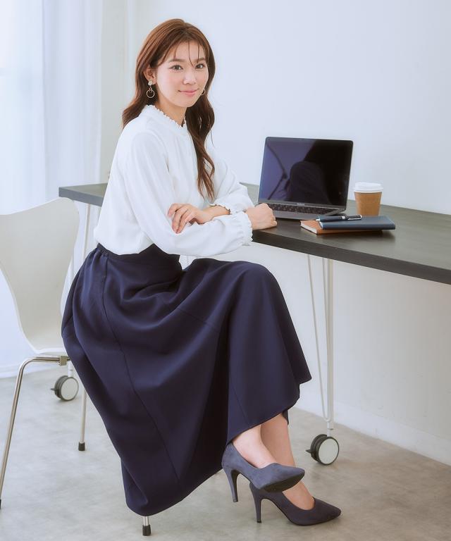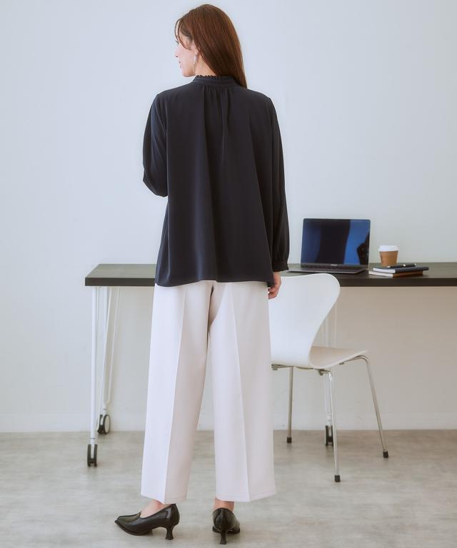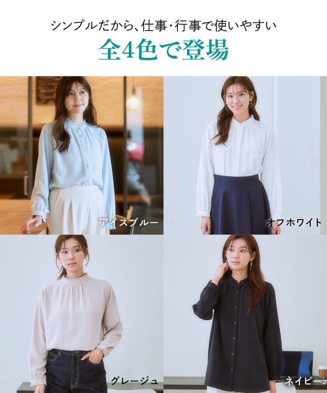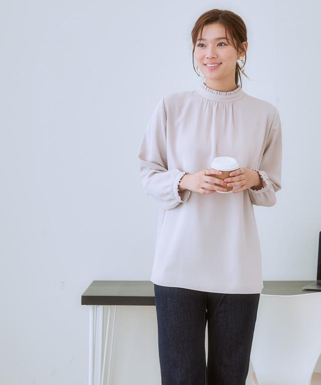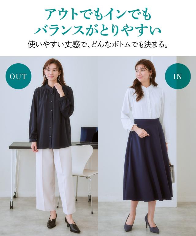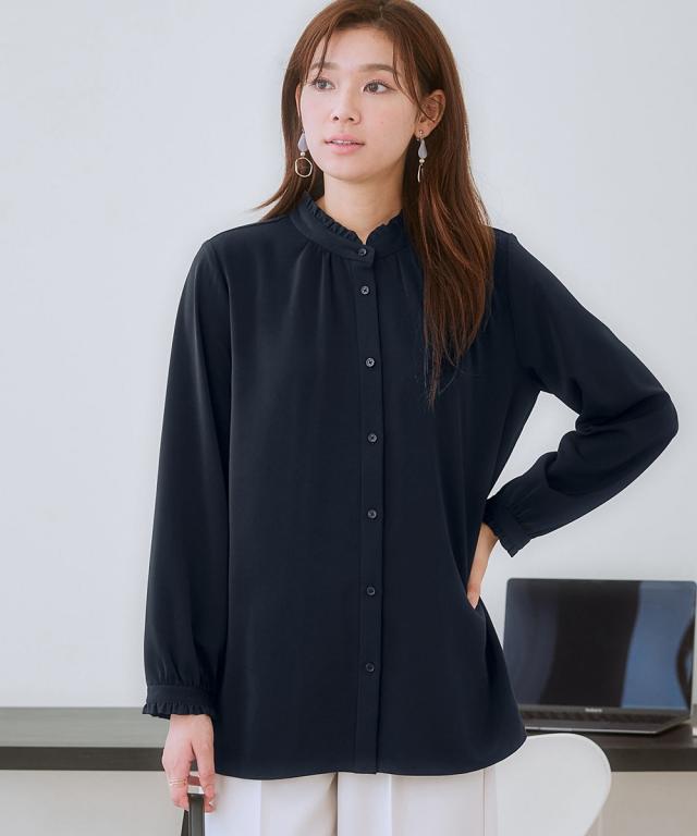 【大人の甘映えフリルブラウス】ほどよいかわいさの控えめなバンドカラーフリル。コーデ力がアップする前後2WAY仕様。■ポイント ・滑らかでとろみのあるトレッチパウダーサテンシリーズ。 ・オンオフたっぷり着まわせる前後2WAYデザイン。■デザイン ・ボタン側を前にしたバンドカラーブラウスとボタン側を後ろにしたプルオーバー風ブラウスが楽しめる前後2WAY。 ・オンオフ着まわせるスタンドフリルブラウス。 ・襟下と袖口にあしらったシャーリングデザインが繊細な雰囲気を演出。 ・タックアウトのパンツ合わせも決まるほどよい丈感。■素材 ・働く女性の毎日をサポートする「しわになりにくい、速乾、洗濯機OK、UVカット」の優秀機能素材。 ・光沢感とストレッチ感のあるパウダーサテン生地。 ・UVカット機能付き。■おすすめのスタイリング ・ギャザー側を前にしたジャケットインスタイルがおすすめ。 ・ボタン側を前にしてパンツと合わせ、タックアウトしたスタイルも素敵。〜7days Life Styling〜 仕事の日、休日、イベントの日まで、 働く女性の毎日を商品やコンテンツを通して、 自分らしく快適でいられる“働く服改革”をサポートします。