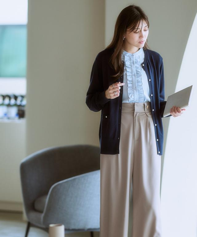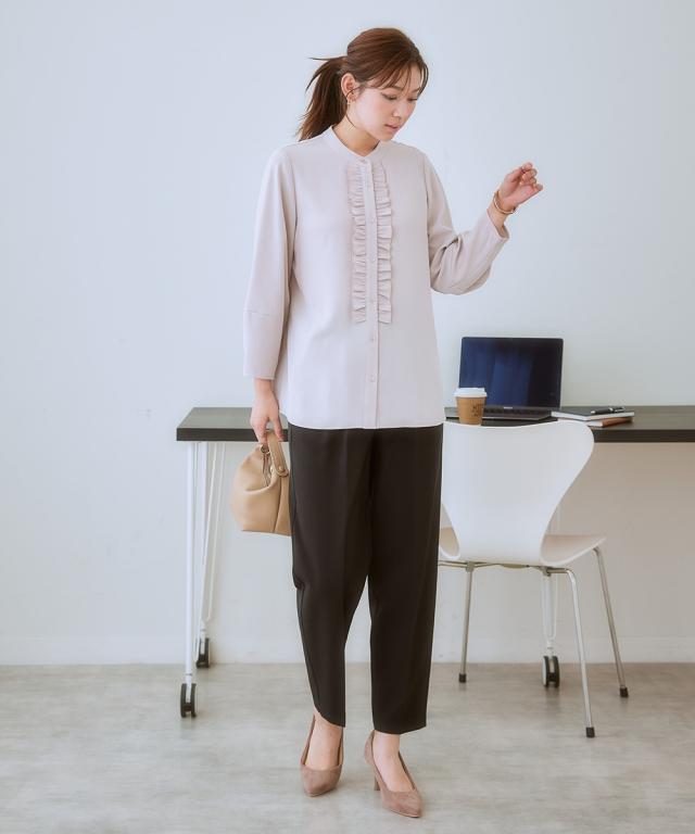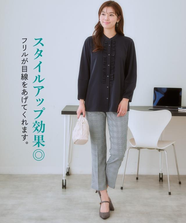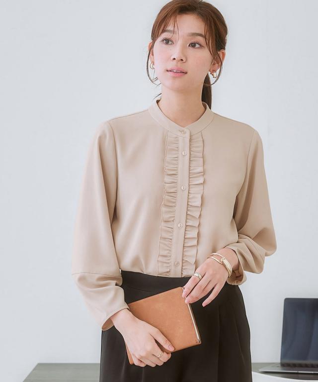 【フリルと全体バランスの甘さを調整した甘やかブラウス】扱いやすさ抜群な高機能素材仕立て。シンプルボトムスに合わせるだけで華やかコーデが即完成。■ポイント ・ストレッチパウダリーサテンシリーズの主役級アイテム。■デザイン ・スタイルアップ見えを狙った、目線を上げるフロントの大胆なフリル仕様。 ・甘くなり過ぎないよう全体シルエットやバンドカラーの衿、裾や袖などをモードテイストに。■素材 ・働く女性の毎日をサポートする「しわになりにくい、速乾、洗濯機OK、UVカット」の優秀機能素材。 ・光沢感とストレッチ感のあるパウダーサテン生地。 ・UVカット機能付き。■おすすめのスタイリング ・甘くなりすぎないパンツスタイルがおすすめ。 ・スカートはもちろん、パンツやデニムと合わせるだけで気のきいたコーデに。〜7days Life Styling〜 仕事の日、休日、イベントの日まで、 働く女性の毎日を商品やコンテンツを通して、 自分らしく快適でいられる“働く服改革”をサポートします。