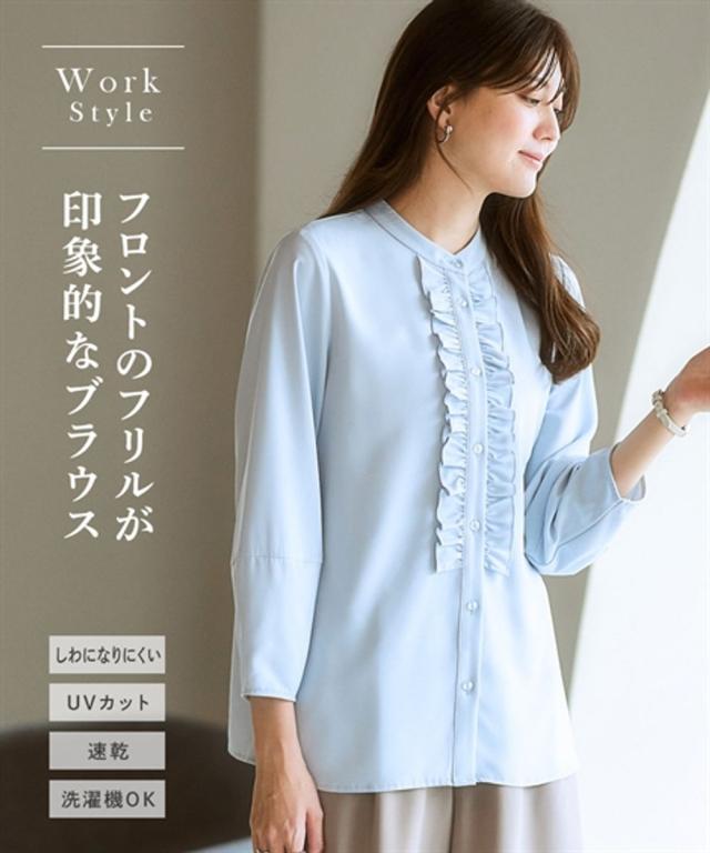 【フリルと全体バランスの甘さを調整した甘やかブラウス】扱いやすさ抜群な高機能素材仕立て。シンプルボトムスに合わせるだけで華やかコーデが即完成。■ポイント ・ストレッチパウダリーサテンシリーズの主役級アイテム。■デザイン ・スタイルアップ見えを狙った、目線を上げるフロントの大胆なフリル仕様。 ・甘くなり過ぎないよう全体シルエットやバンドカラーの衿、裾や袖などをモードテイストに。■素材 ・働く女性の毎日をサポートする「しわになりにくい、速乾、洗濯機OK、UVカット」の優秀機能素材。 ・光沢感とストレッチ感のあるパウダーサテン生地。 ・UVカット機能付き。■おすすめのスタイリング ・甘くなりすぎないパンツスタイルがおすすめ。 ・スカートはもちろん、パンツやデニムと合わせるだけで気のきいたコーデに。〜7days Life Styling〜 仕事の日、休日、イベントの日まで、 働く女性の毎日を商品やコンテンツを通して、 自分らしく快適でいられる“働く服改革”をサポートします。