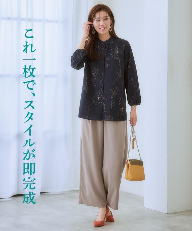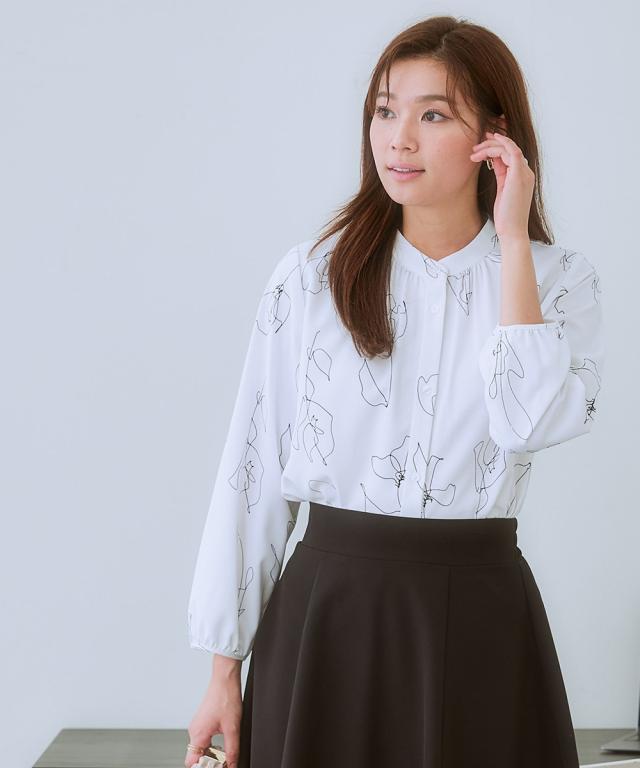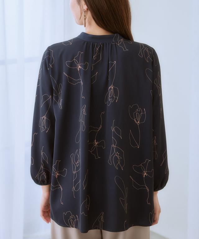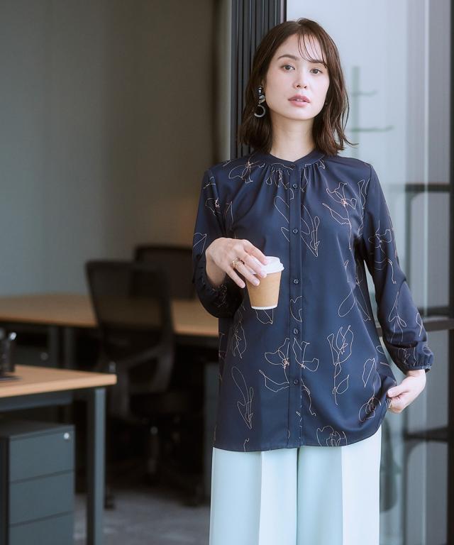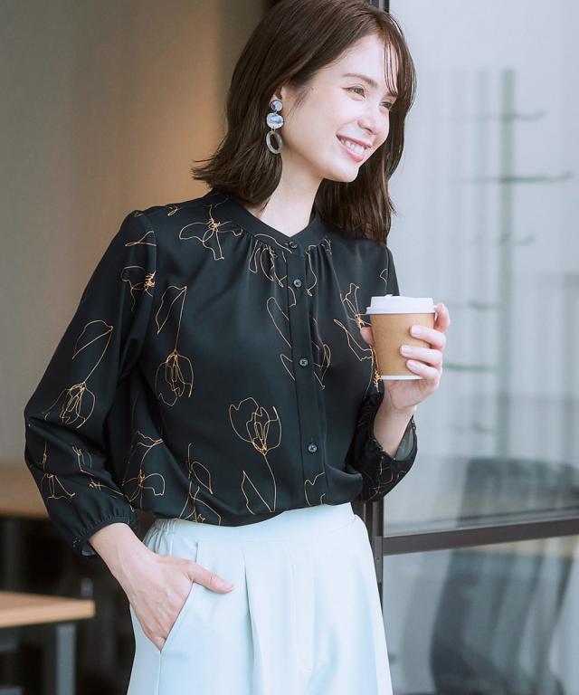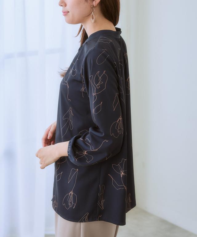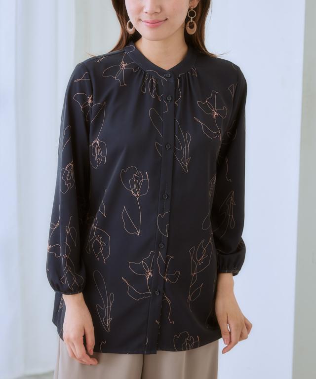ストレッチパウダーサテン線画フラワー柄バンドカラーブラウス(しわになりにくい・速乾・洗濯機OK・UVカット)
