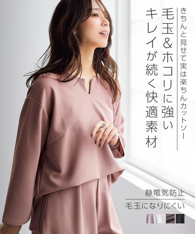 毎日、着るものだから嬉しい!静電気・毛玉・ほこりが起こりにくいキレイ見え素材!伸縮性があって着心地も快適です。■デザイン 顔周りがすっきり見えるスキッパータイプの衿になっています。寒い時は中にタートルを合わせてもスッキリきまります。ゆったりしたサイズ感でふんわり体型をカバーしてくれます。■素材 ツイル目になっているのでカットソーでもブラウスっぽく見えてきちんと感ある仕上がりに。でもカットソーなので伸縮性があって楽々。毛玉ができにくいので長く使っていただけます。今の時期に嫌な静電気も防止してくれるので安心して着用できます。静電気が起きにくいのでほこりがくっつきにくく綺麗が長持ち。夏以外は使える万能素材です。■コーディネート 1枚でスッキリきまる1枚です。ボリュームのあるワイドパンツやフレアスカートとも好相性な1枚。寒い時は中にタートルを合わせてもかわいくてお勧めです。