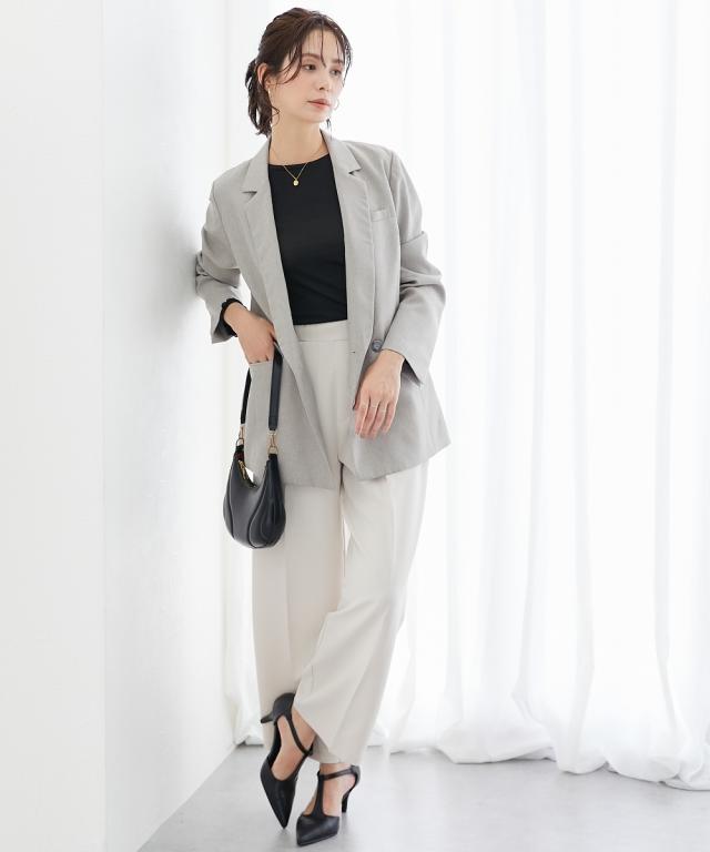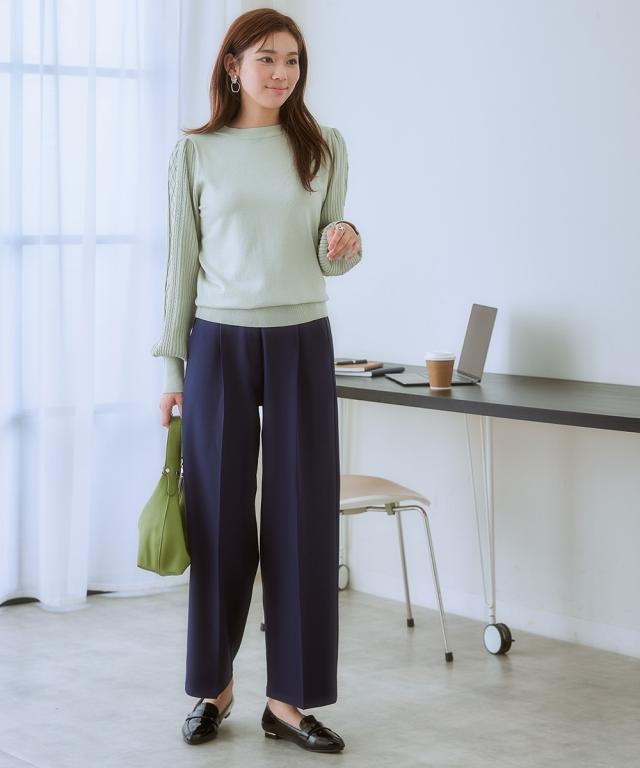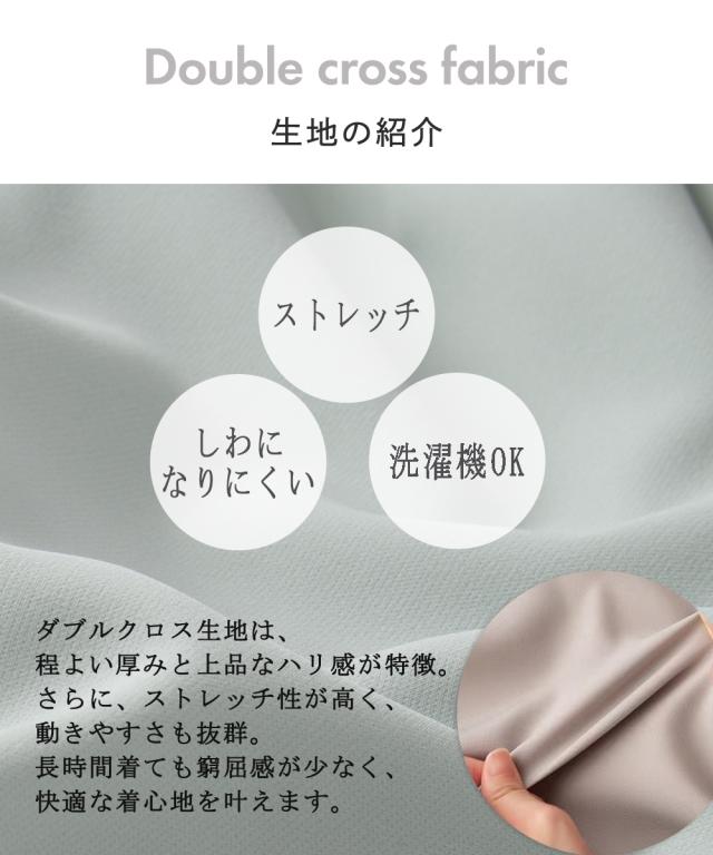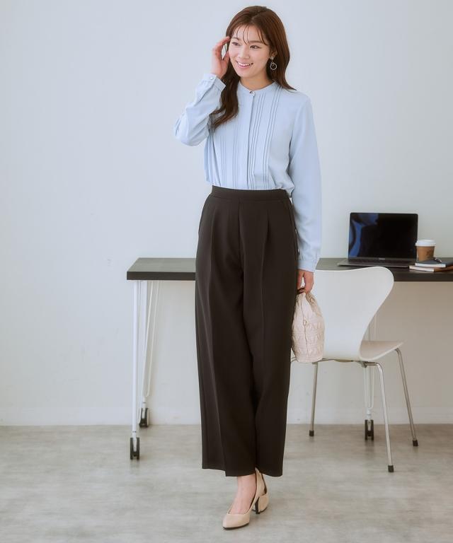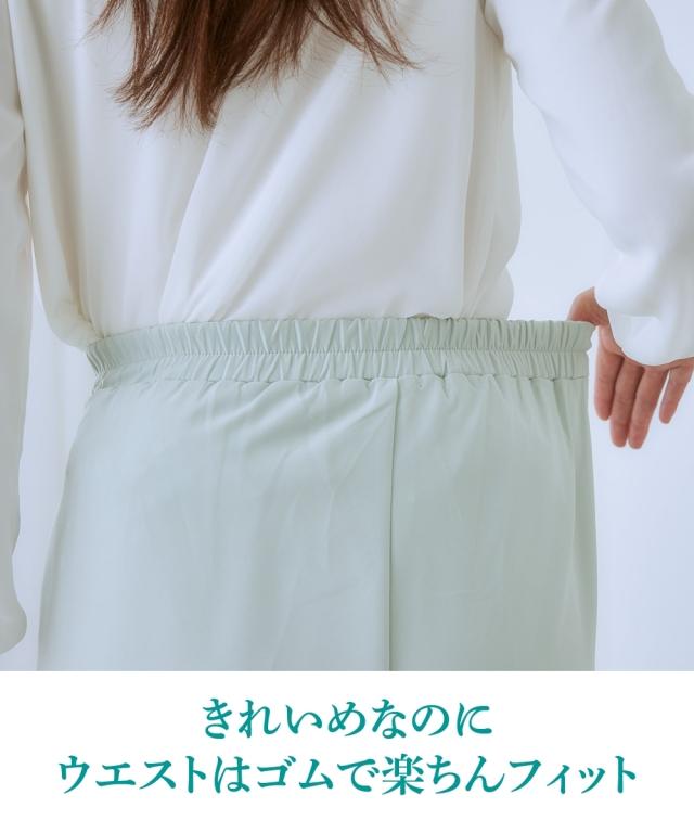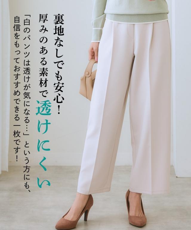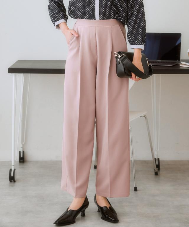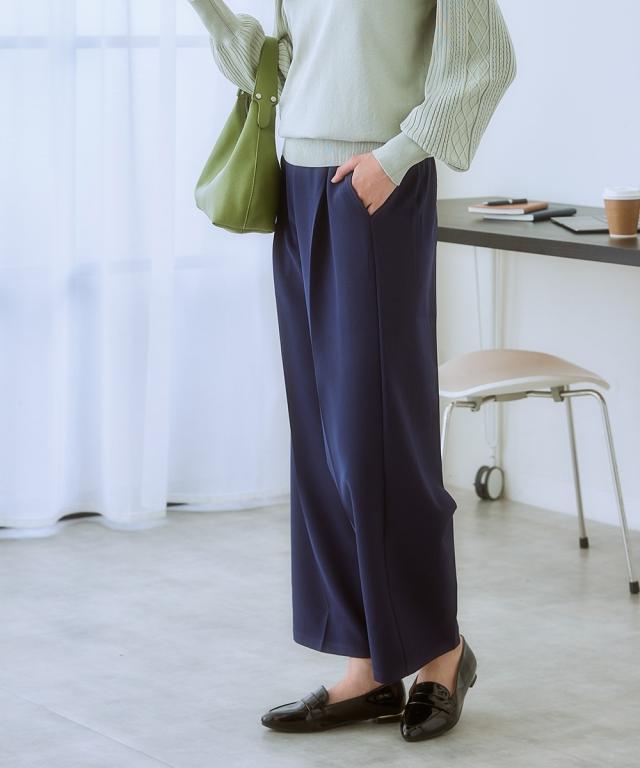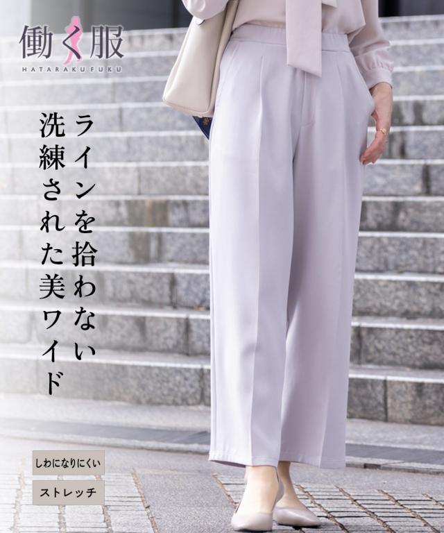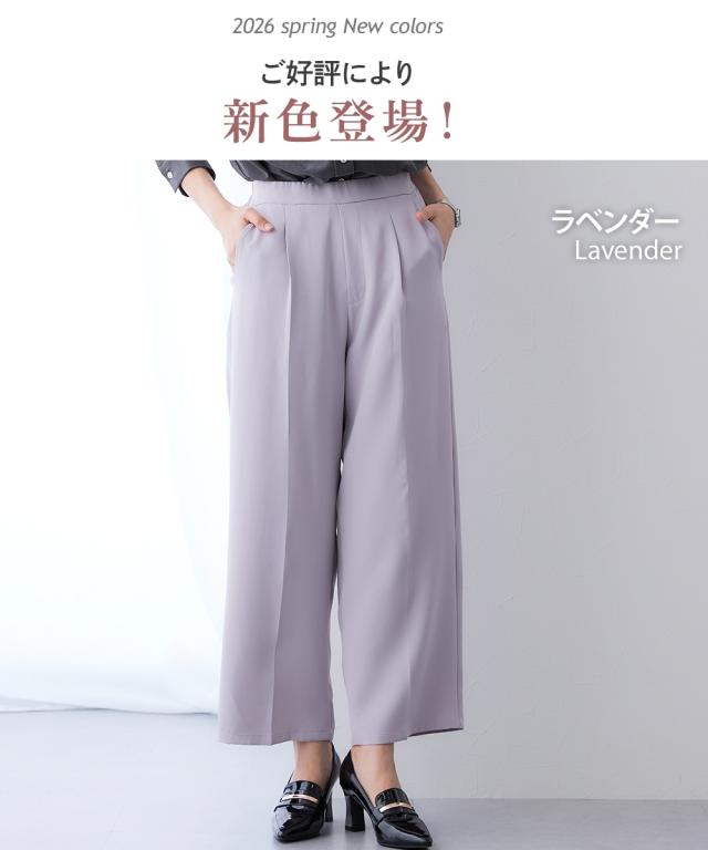 【脚がきれいに見える万能定番パンツ】シルエットにこだわった計算づく設計。ベーシックカラーもきれい色も色ちがいでそろえて間違いなし。■ポイント ・ラインを拾わないワイドシルエットでほっそり見え効果あり。 ・きれいめなのにバックウエストゴムでイージーな着心地。 ・ストレッチの効いた人気のダブルクロス素材のパンツ。■デザイン ・フロントタックでお腹と腰まわりがすっきりきれいに見えるシルエット。 ・ラインを拾わないワイドシルエットながら、落ち感のある素材ですっきり。 ・ストレスフリーで過ごせるバックウエストゴム仕様。■素材 ・ストレッチの効いた高見えダブルクロス素材。■おすすめのスタイリング ・きれいめブラウスと合わせたオンスタイルはもちろん、シアートップスなどカジュアルアイテムにもマッチ。〜7days Life Styling〜 仕事の日、休日、イベントの日まで、 働く女性の毎日を商品やコンテンツを通して、 自分らしく快適でいられる“働く服改革”をサポートします。