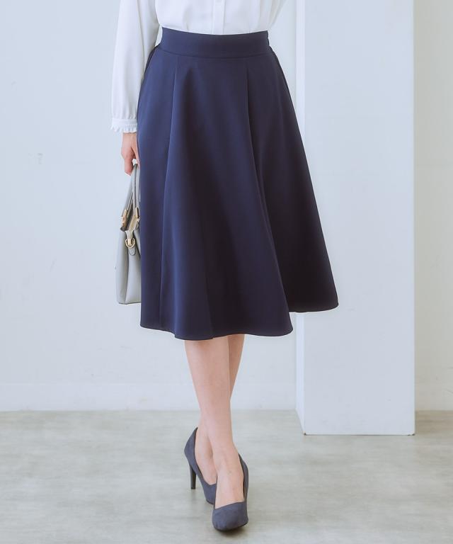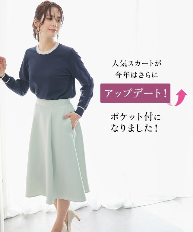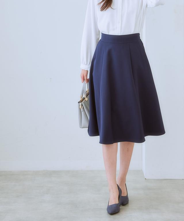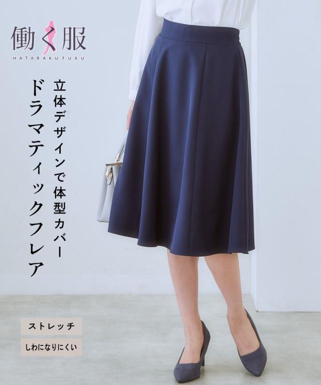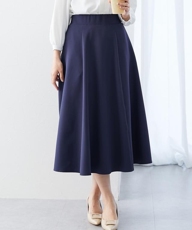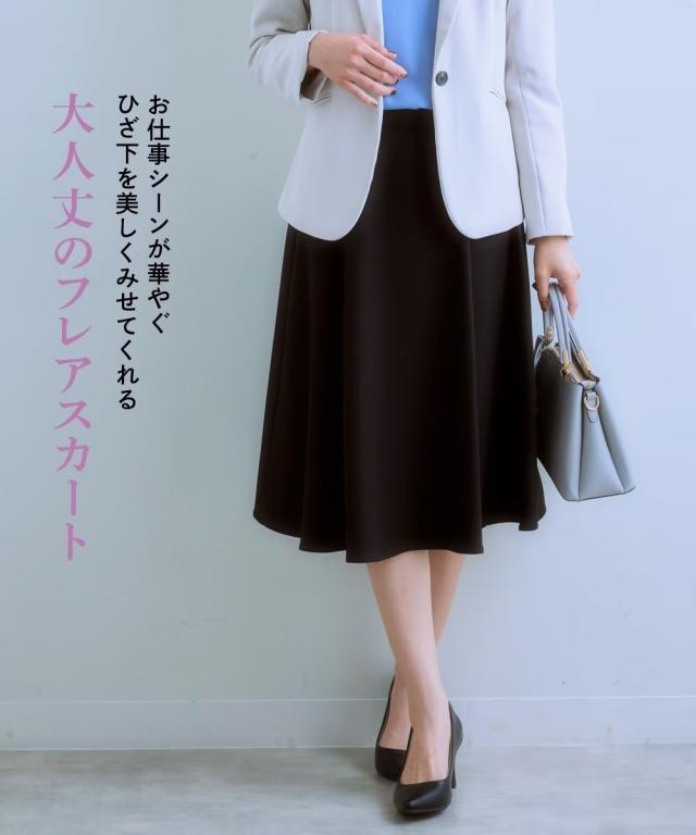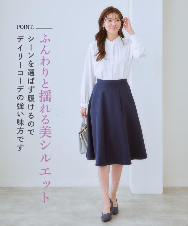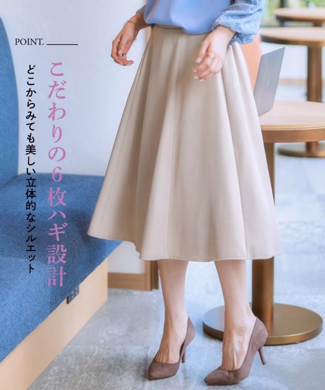 【立体感が美しい、ひざ下丈フレアスカート】脚をほどよく隠しながら、ドラマティックなシルエットでコーデを華やかに。■ポイント ・どこから見ても美しい6枚ハギ立体デザインで体型カバーする、ドラマティックフレア。 ・ひざ下を美しく見せる丈感。■デザイン ・広がりすぎないきれいな落ち感とフレアシルエットで毎年人気のスカート。 ・ウエストは後ろゴムで着心地楽ちん。■素材 ・ほどよく肉厚なのにとろみ感と落ち感があり、きれいなシルエットがつくれる素材。 ・通年使えるダブルクロス素材。■おすすめのスタイリング ・長すぎないコンパクトなジャケットと合わせると好バランスに。 ・フレアシルエットなのでトップスインや裾バルーンのブラウス合わせもおすすめ。〜7days Life Styling〜 仕事の日、休日、イベントの日まで、 働く女性の毎日を商品やコンテンツを通して、 自分らしく快適でいられる“働く服改革”をサポートします。