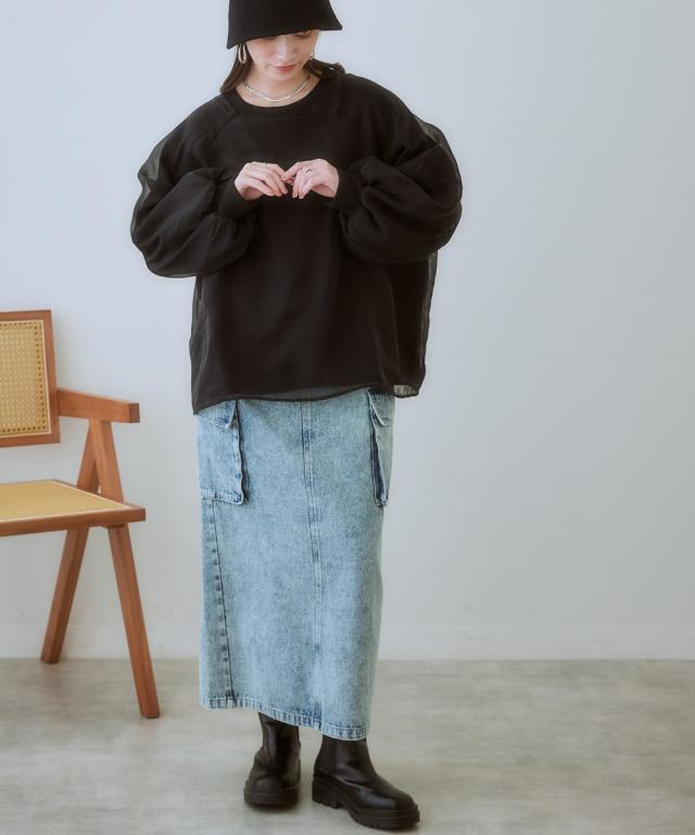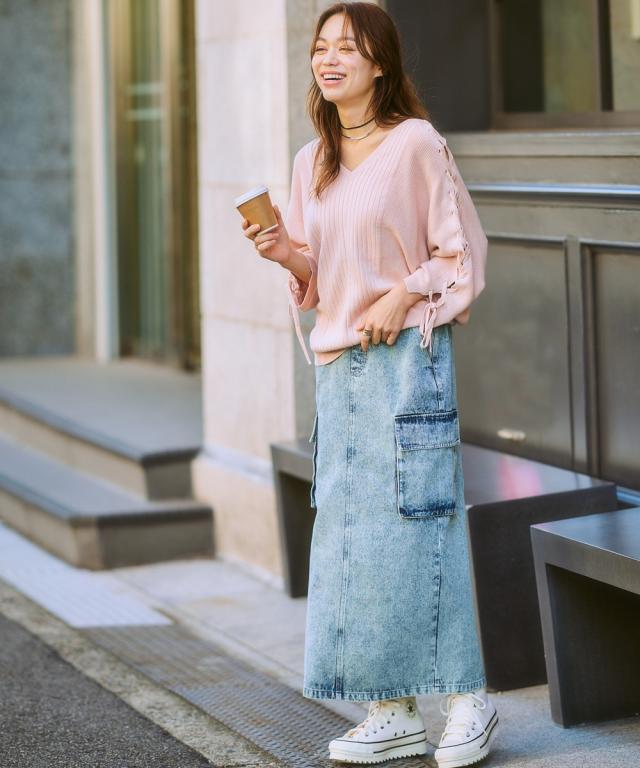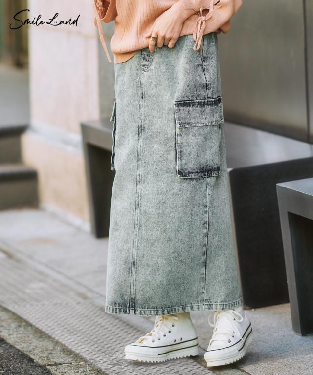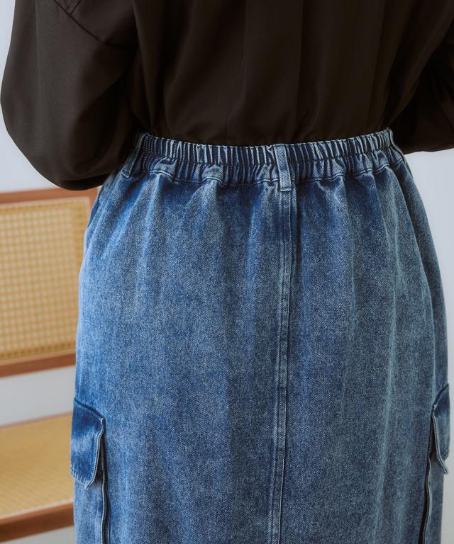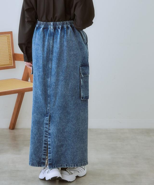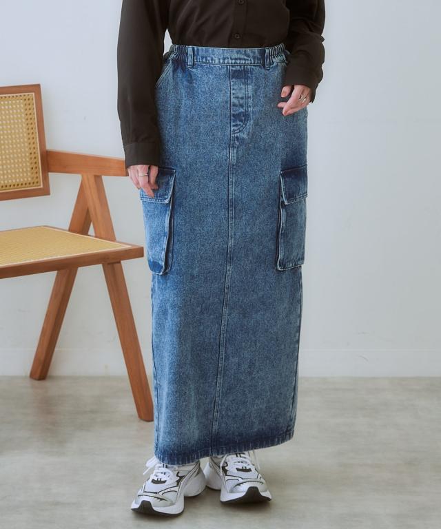 大人可愛い、こなれ感漂うデニムスカート ■デザイン カジュアルだけど、どこか上品な雰囲気も漂う、大人女子にぴったりのデニムスカート。 程よくゆとりのあるシルエットで、体型カバー効果も期待できます。 ■素材 味のある加工感が素敵なデニムスカート。 一枚一枚違う常用で、こなれ感があり、着こなしに深みを与えてくれます。 ■おすすめのスタイリング カーゴタイプなのでカジュアルトップスとの相性は抜群ですが、反対にちょっとキレイ目のブラウスとの相性もバッチリ! カジュアルとキレイ目のコーデを叶える便利なスカートです。
