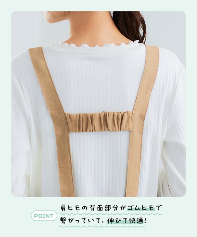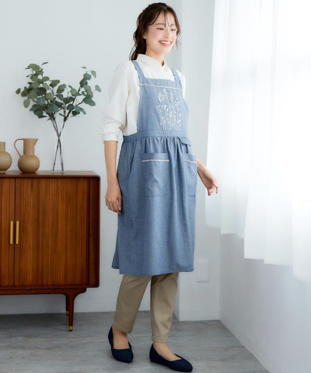 ナチュラルテイストがかわいいお花の刺しゅう入りエプロン ■デザイン 胸元に刺しゅうをあしらったエプロン ウエスト切替でふんわりかわいらしいシルエットに。 ナミナミのテープがアクセント。 大きめポケットとタオル掛けもついて実用的なデザインです。 肩ひもの間にはゴムがはいっているので柔軟な動きにも対応! 肩ひもがずれたりしづらくなってうれしいですね! 長さはお好みでボタン調整してね! ■素材 ナチュラル感ある綿混の生地。柔らかいけれどダレない程よい厚み。 ■おすすめのスタイリング 実用的に使うことはもちろん、ナチュラル系のプラスアイテムにするのもかわいいですね