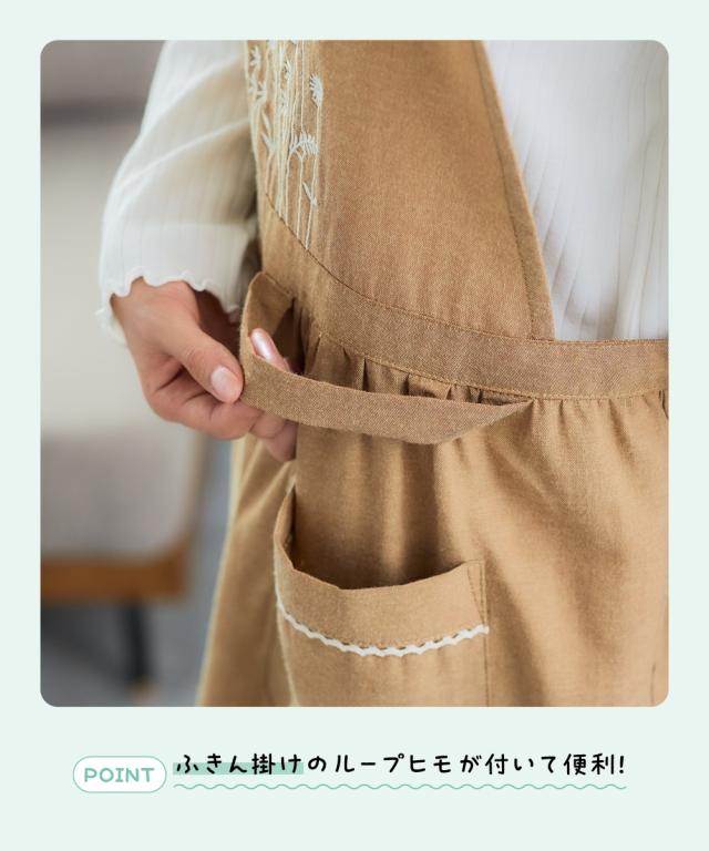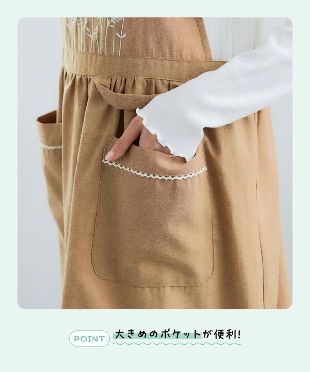 ナチュラルテイストがかわいいお花の刺しゅう入りエプロン ■デザイン 胸元に刺しゅうをあしらったエプロン ウエスト切替でふんわりかわいらしいシルエットに。 ナミナミのテープがアクセント。 大きめポケットとタオル掛けもついて実用的なデザインです。 肩ひもの間にはゴムがはいっているので柔軟な動きにも対応! 肩ひもがずれたりしづらくなってうれしいですね! 長さはお好みでボタン調整してね! ■素材 ナチュラル感ある綿混の生地。柔らかいけれどダレない程よい厚み。 ■おすすめのスタイリング 実用的に使うことはもちろん、ナチュラル系のプラスアイテムにするのもかわいいですね